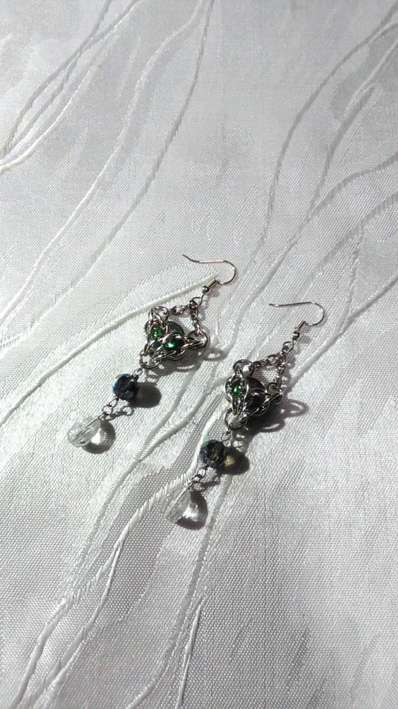 オーロラ掛かったグリーングラデーションの輪っかガラスパーツ、ドロップ型のチェコビーズ等を使用しました💕