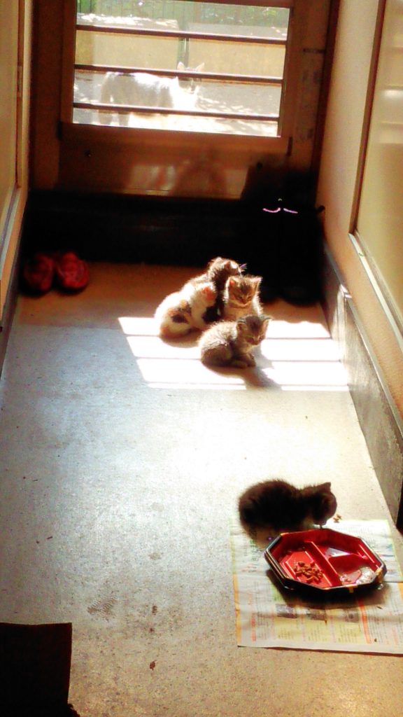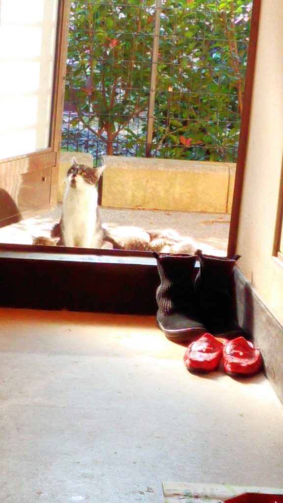 9日(水)のにゃんずは、ご飯を食べて小屋に戻したら私の所に来たくて囲いを登って出てきちゃいました