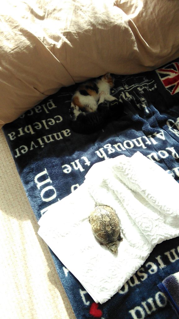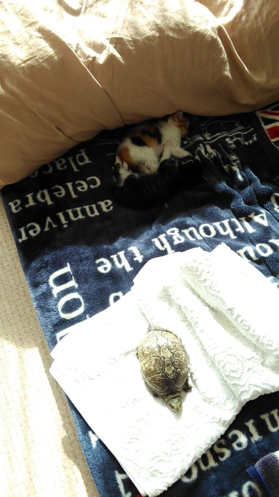 起きてからご飯、おトイレ終わって1時間位亀吉と一緒にみんなで寝ました🐢😺😺