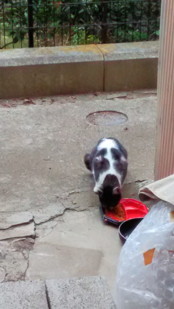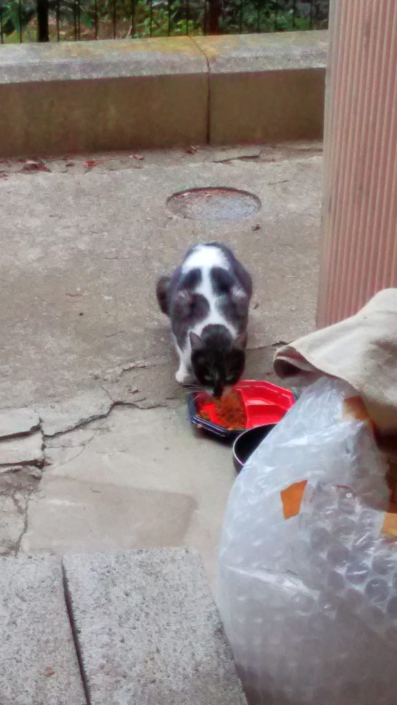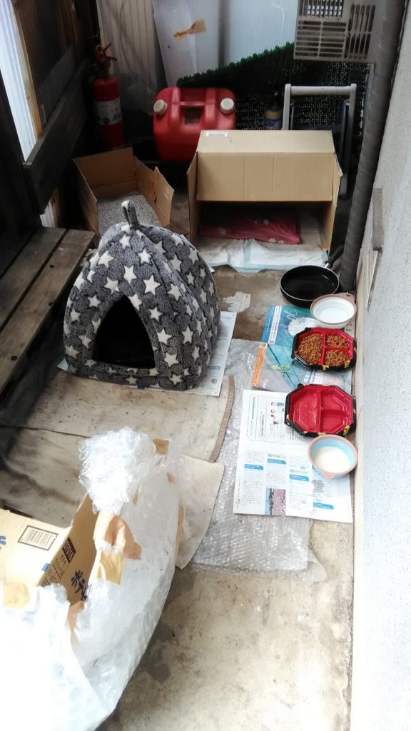 お母さん猫のブチコさんにまずはエサをあげてから、小屋の掃除をして様子を見ました😺