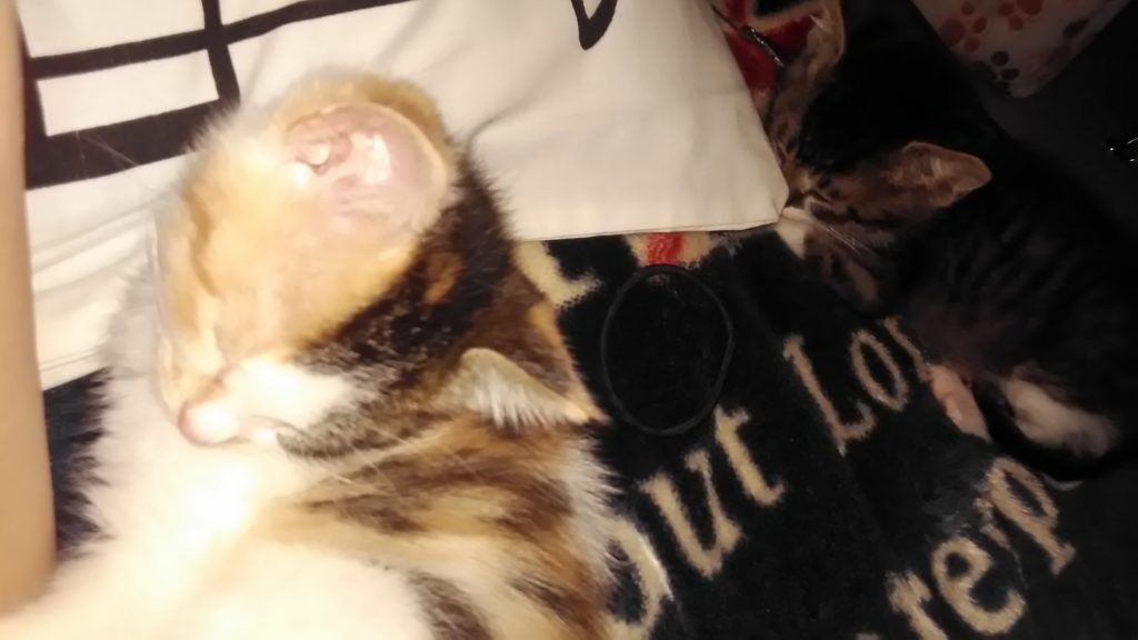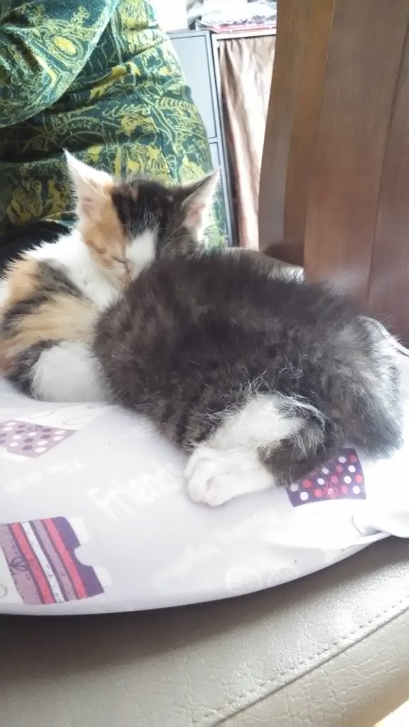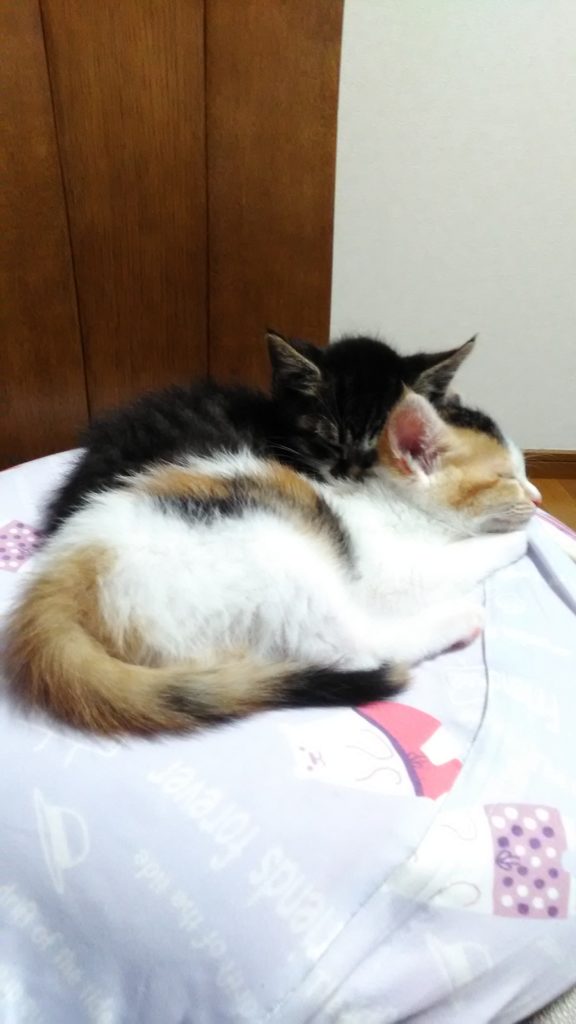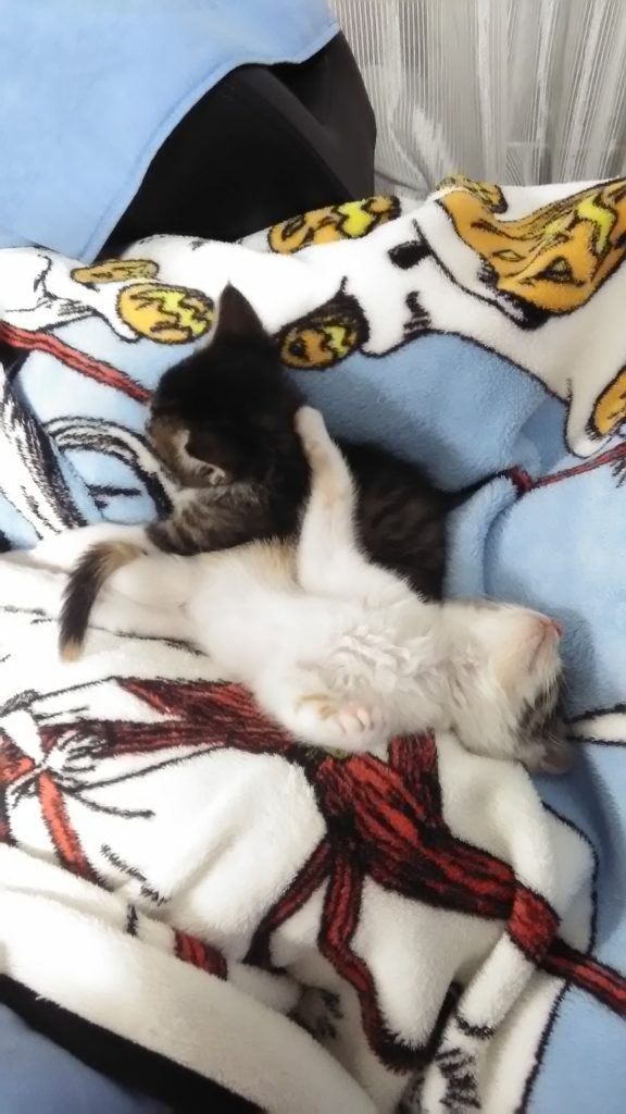 帰宅してご飯食べ終わり、ばぁばとお気に入りのネズミの猫じゃらしで遊び疲れたチッチとこぶちは寝てました😺😺💤