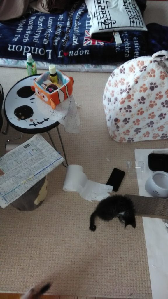 ミニテーブルの上の物を落とすは、トイレットペーパーはグチャグチャだし、大変な事になってました😰💦