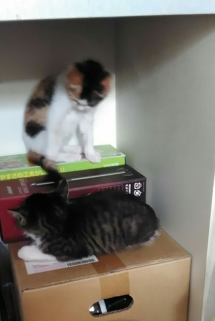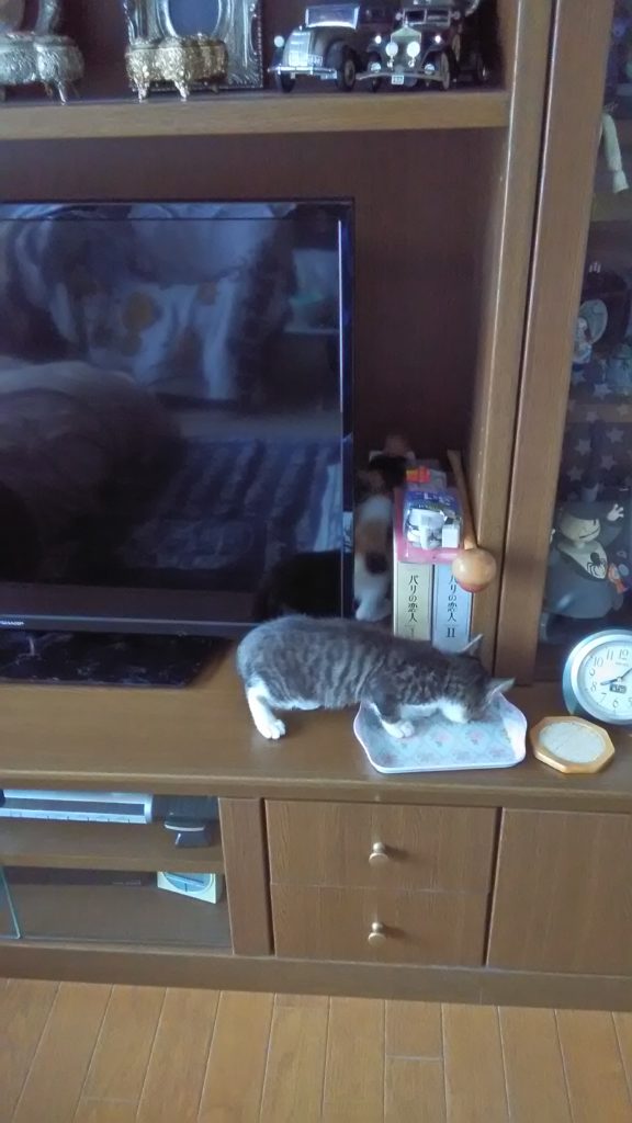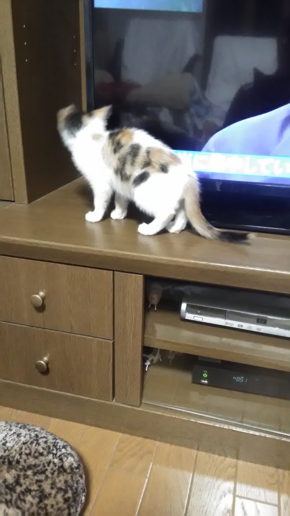 テレビの棚に上がれるようになったこぶちはお気に入りのようです😅