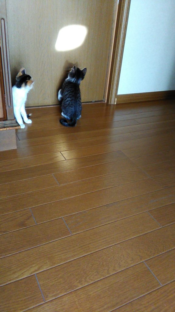 こぶちがばぁばが鏡で作った光を見つめています✨