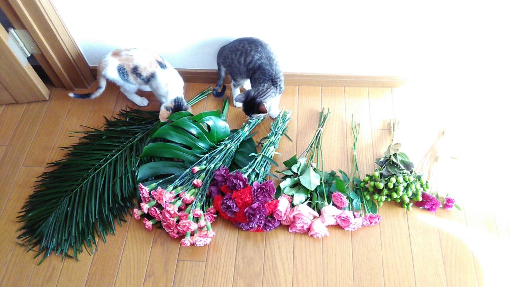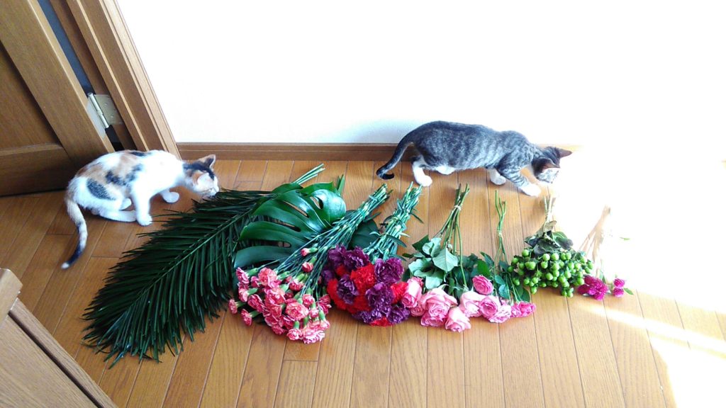 お花をドライフラワーにしようと並べていたら、気になるチッチとこぶち😺😺