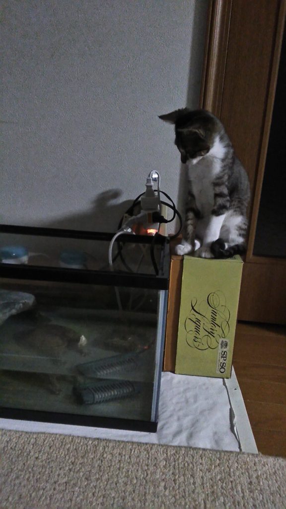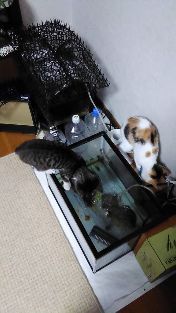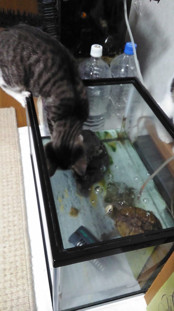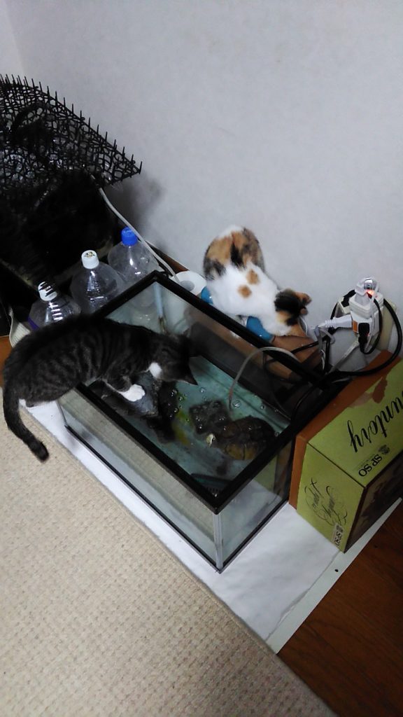 ばぁばが亀吉の水槽ににゃんずが近づくと心配しますが・・・
