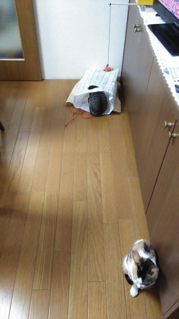 21時10分 チッチ、こぶち、猫じゃらしで遊びました😊