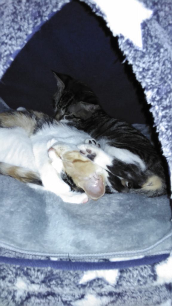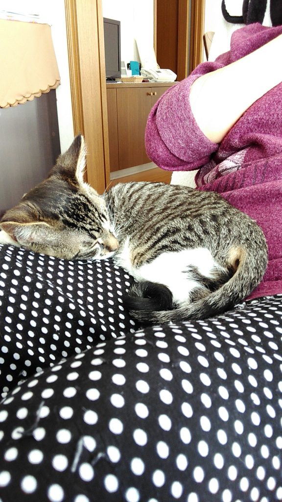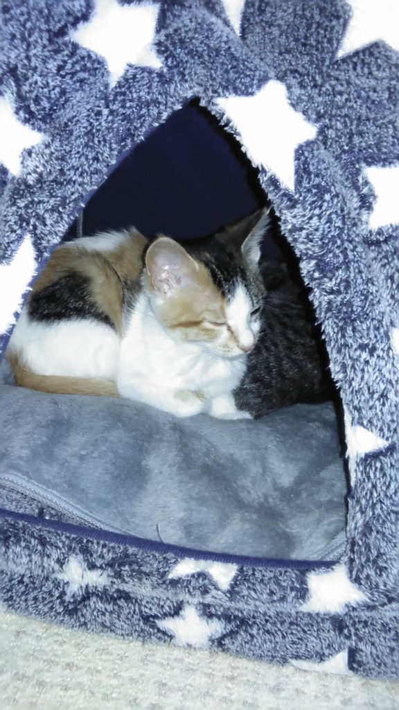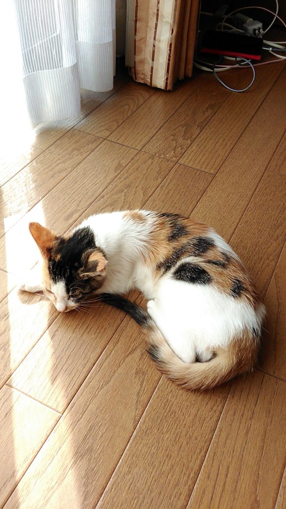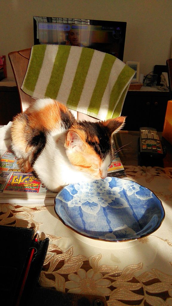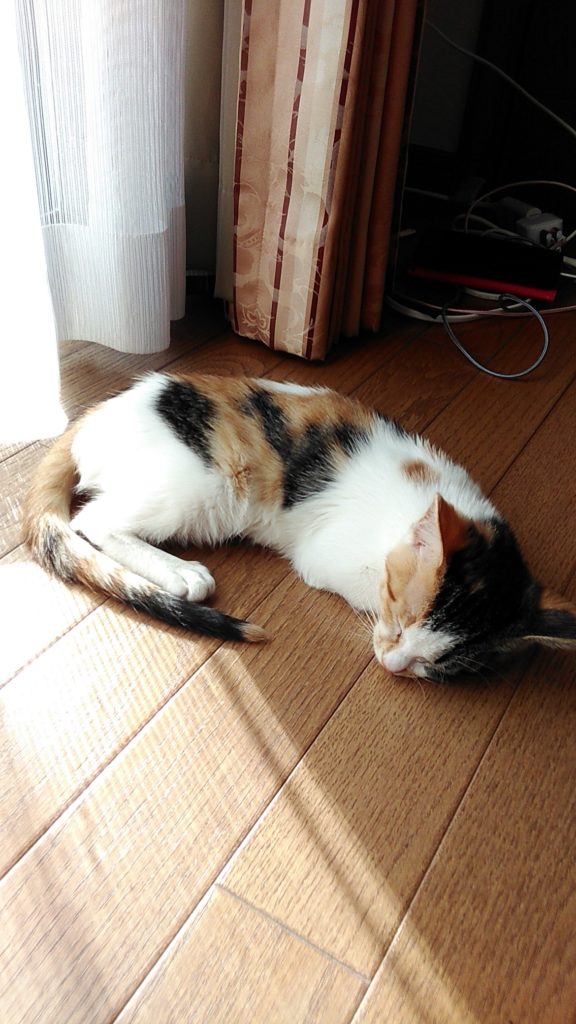 9時10分 こぶち、お水のお皿の所で寝てしまいました💤