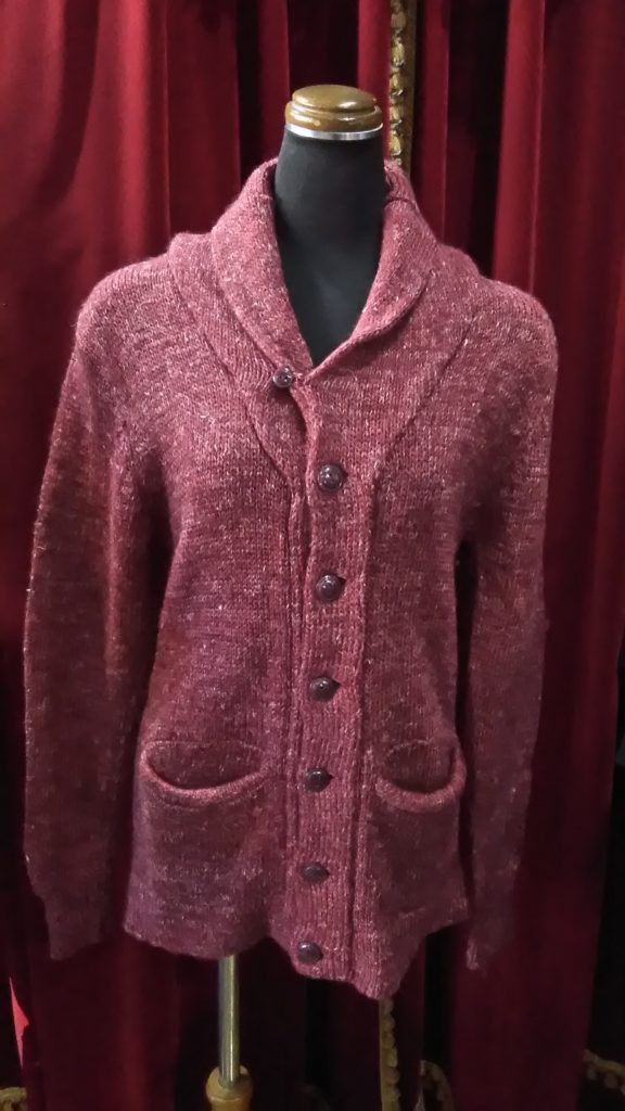 MEN’Sのレッド・ニットカーディガン、earth & ecology・ダウンフェザーコート、ブラック×小花・ショルダーバッグ