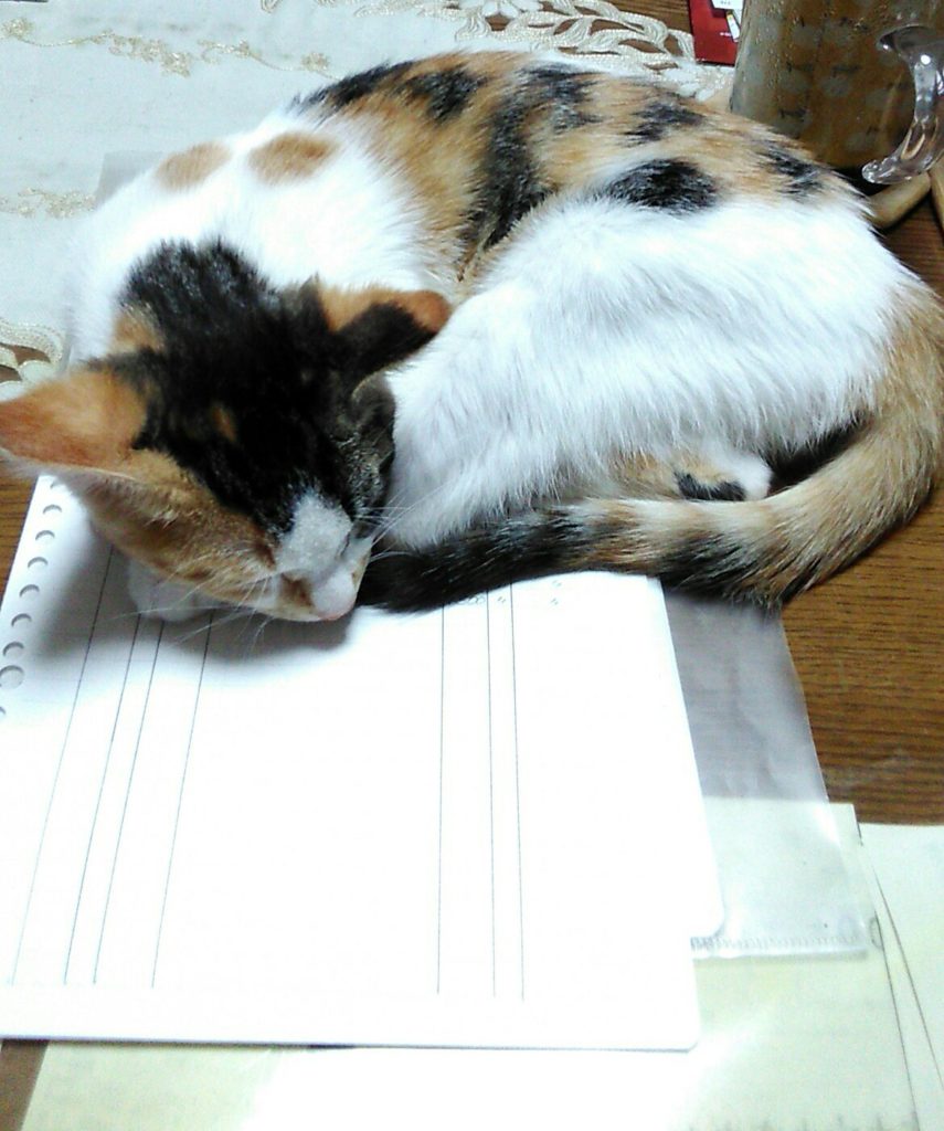 私が仕事をしていたら、かまってちゃんのこぶちがノートの上にちょこんと座りました💕