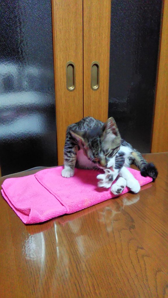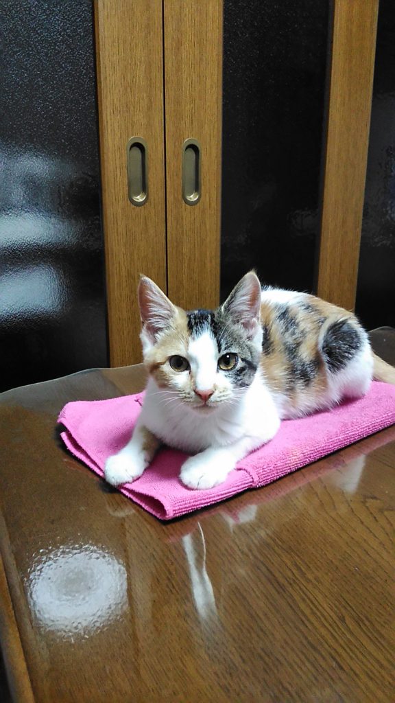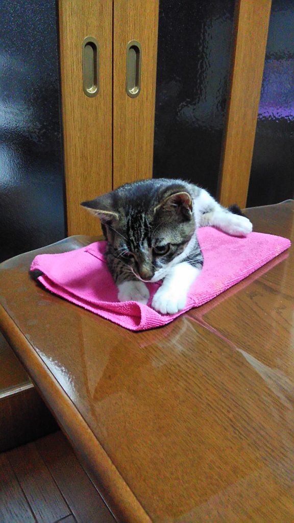 最近は、テーブルの上のピンクのタオルがお気に入りのようです♪