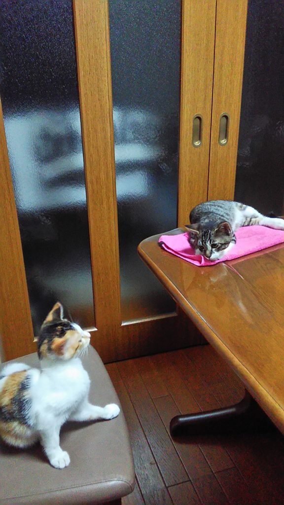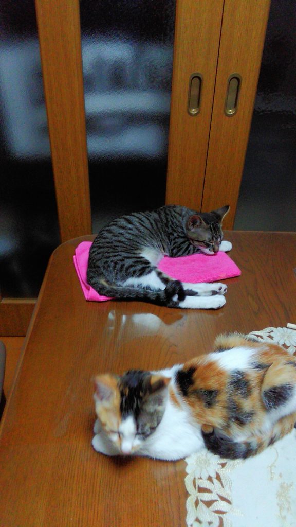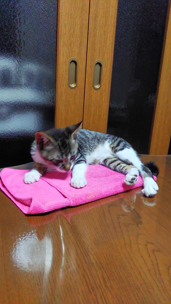 夜はテーブルの上のピンクタオルで寝てたみたいね💤