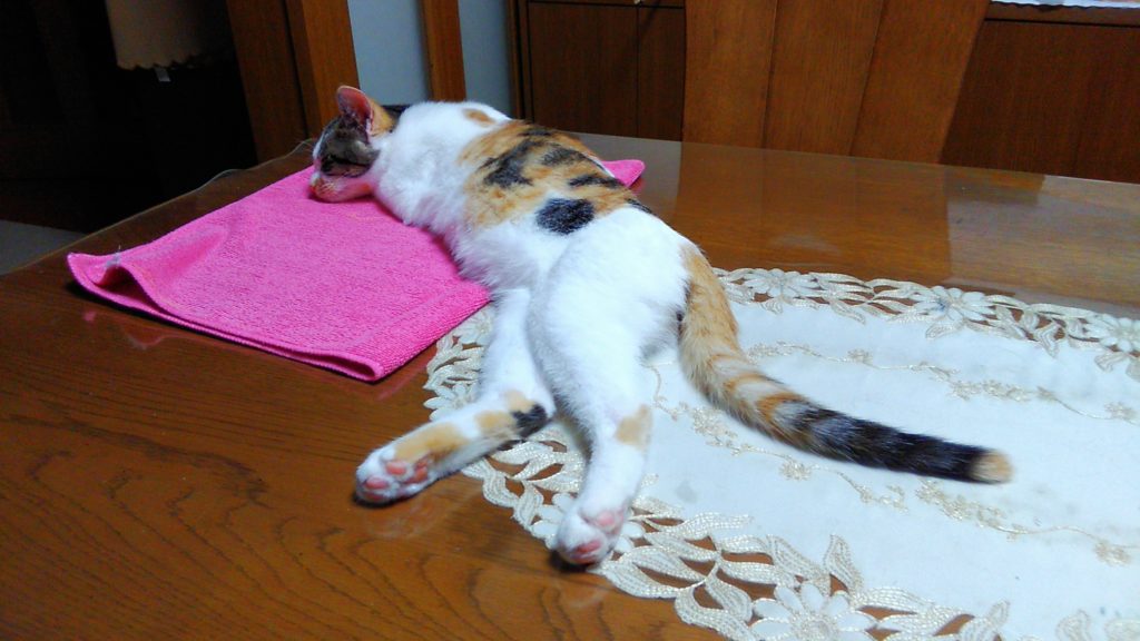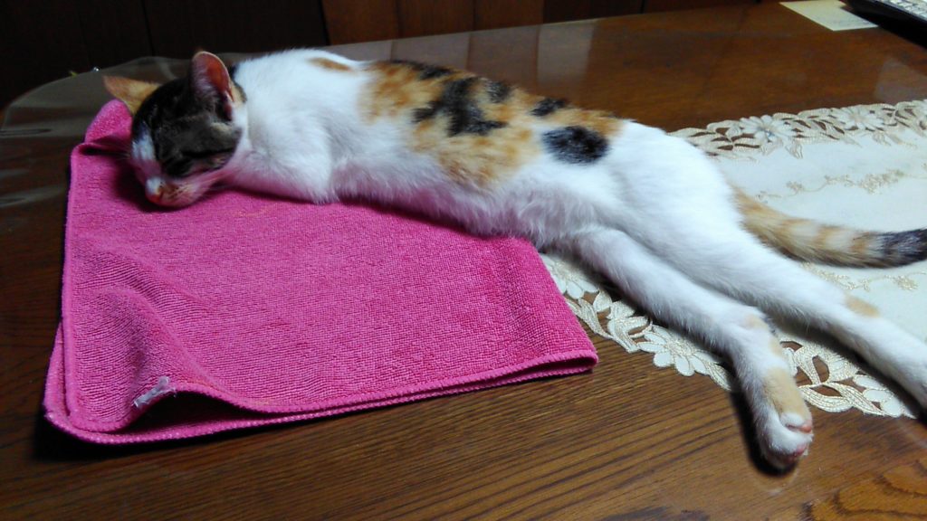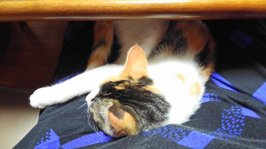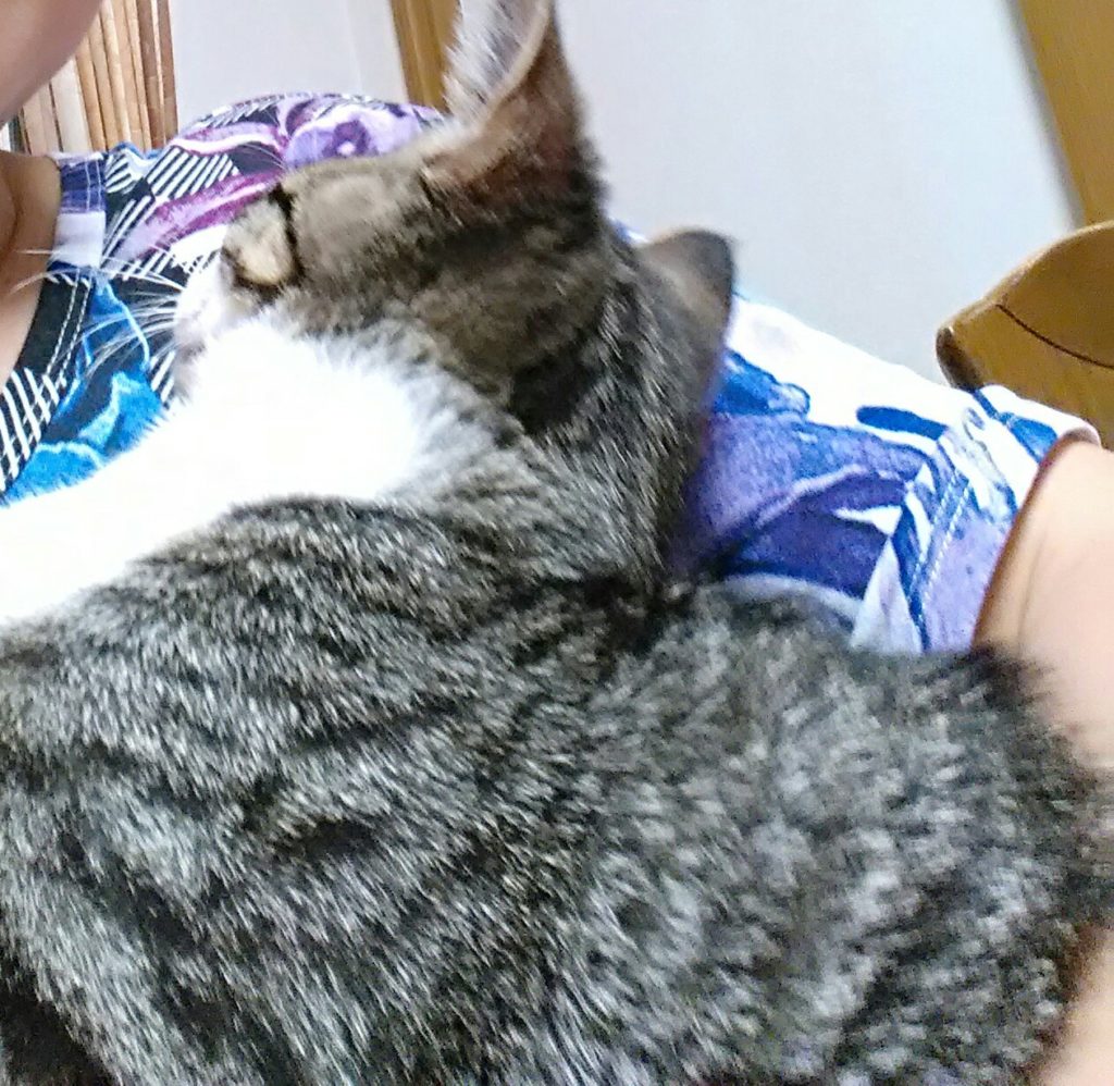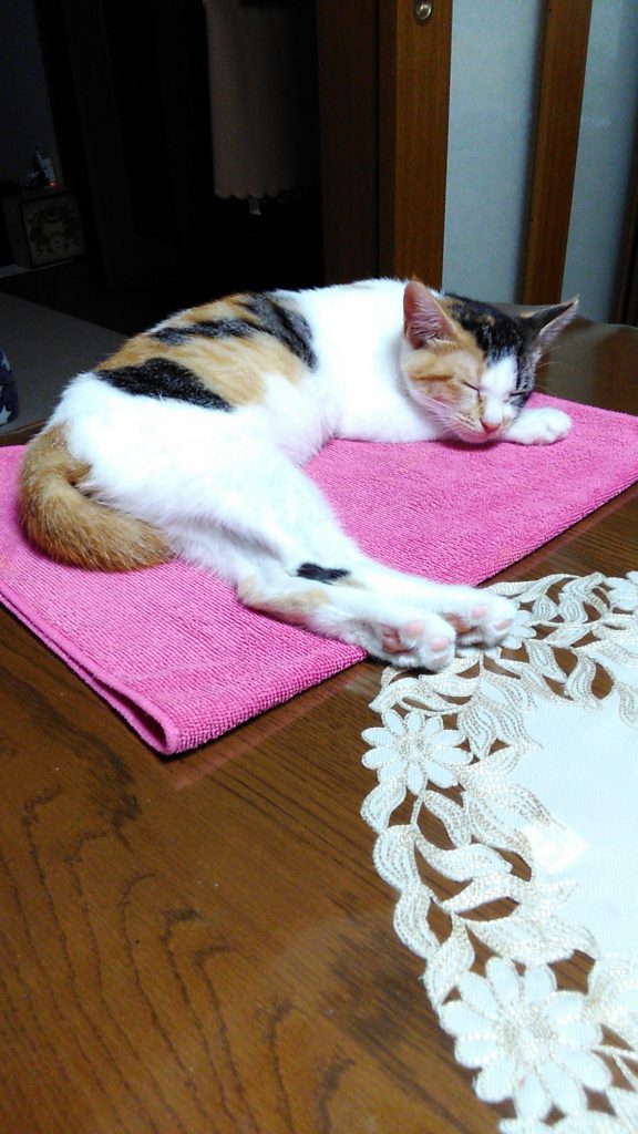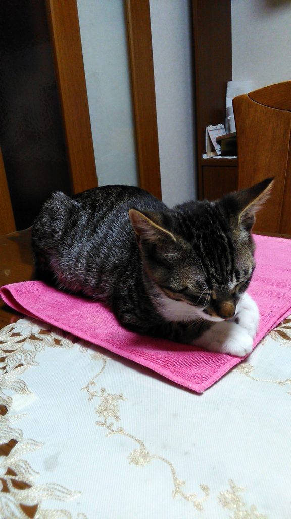 私がテーブルで本を読んでいたら、近くで寝たこぶち😺💕