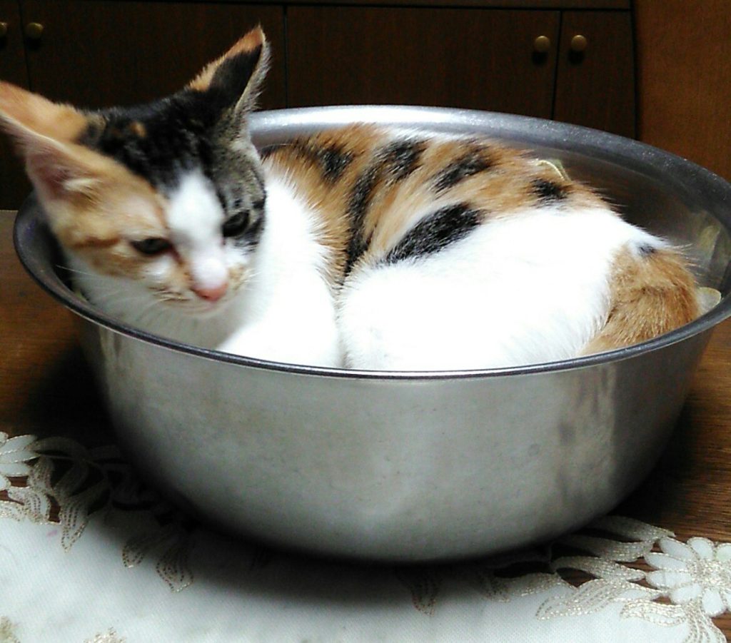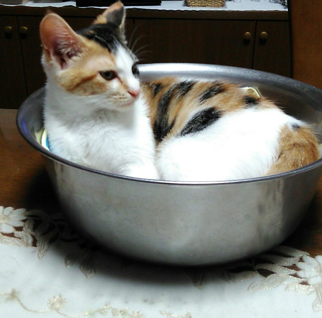 こぶちはお気に入りの洗面器の中でくつろいでいます💕