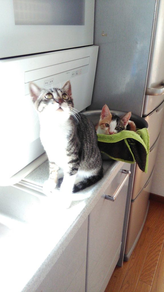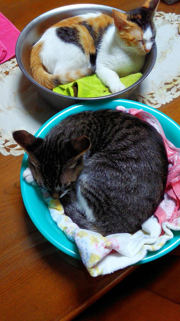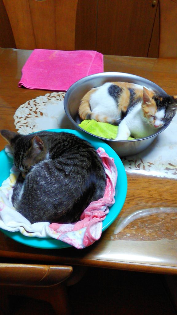 寝ぼけて落ちたら危ないので、テーブルに移動させたらチッチも洗面器に入ってました😺