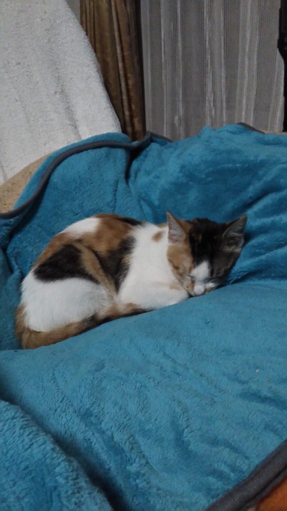 やっと落ち着き寝たので、抱っこしてマッサージチェアに連れて行きました