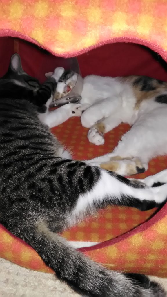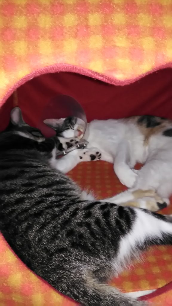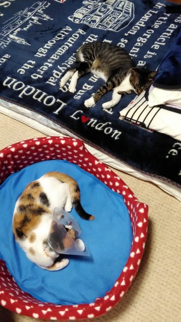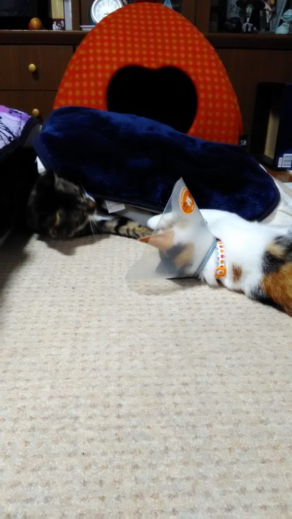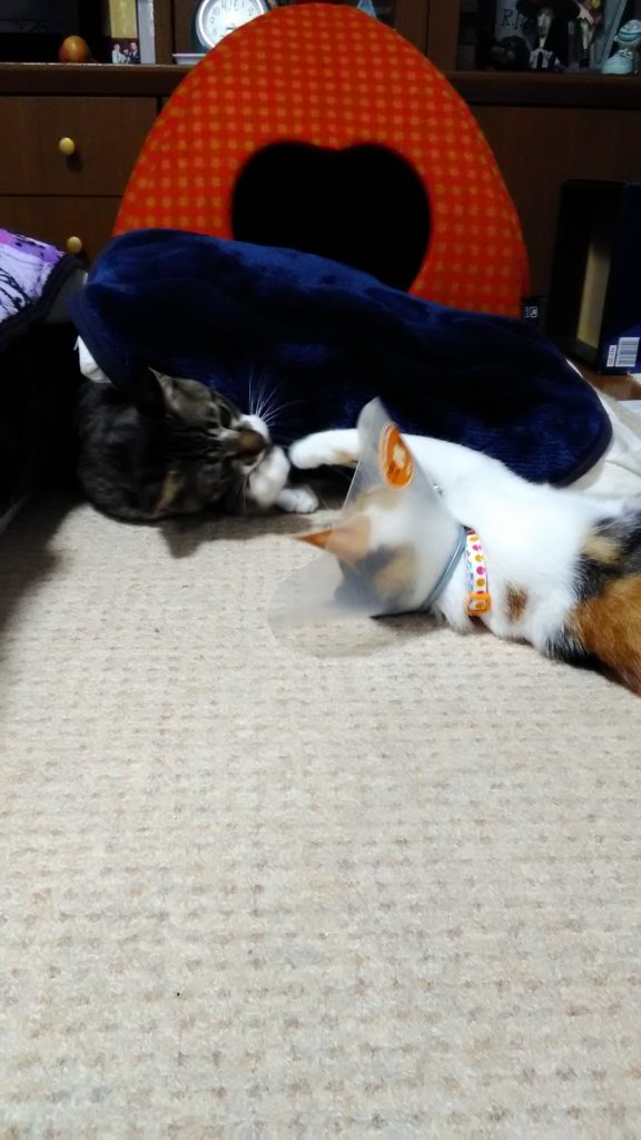 でも、聞いたらこぶちの方が先に私の帰宅を察知して行こうと思ったのに手術後のエリザベスカラーがドアに引っかかって出れなかったらしいです😅