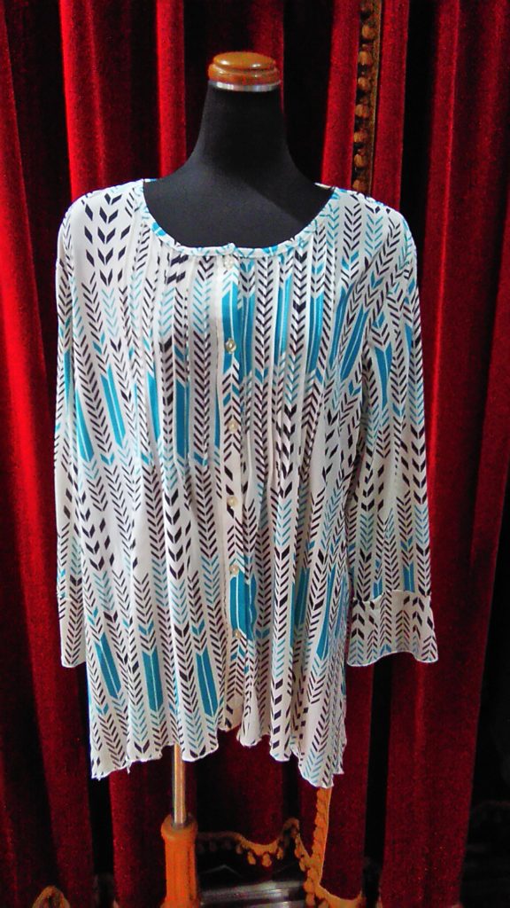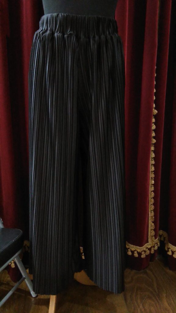 ホワイト×ブルー柄・チュールカーディガン、ブラック×プリーツ・ワイドパンツ