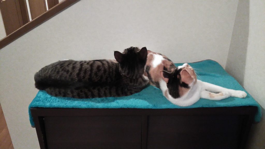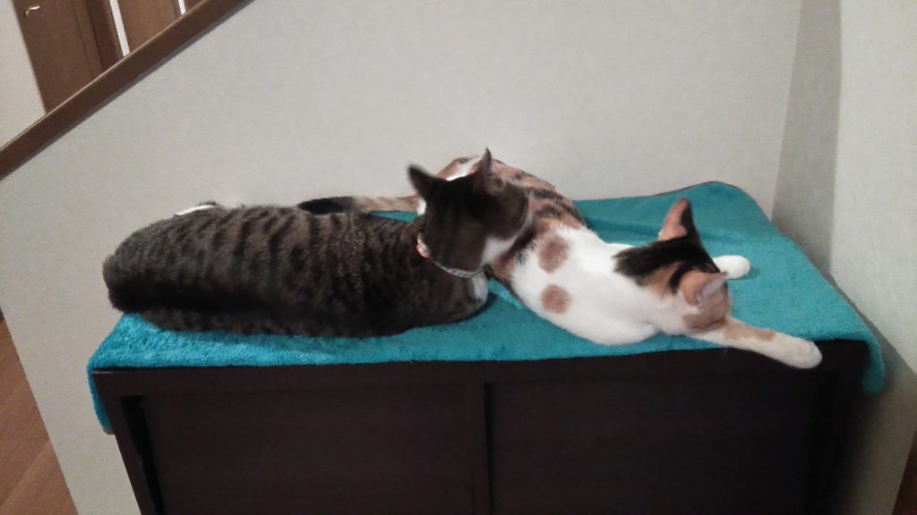 こぶちっちは最近お気に入りの棚の上で仲良く朝まで寝てました💤