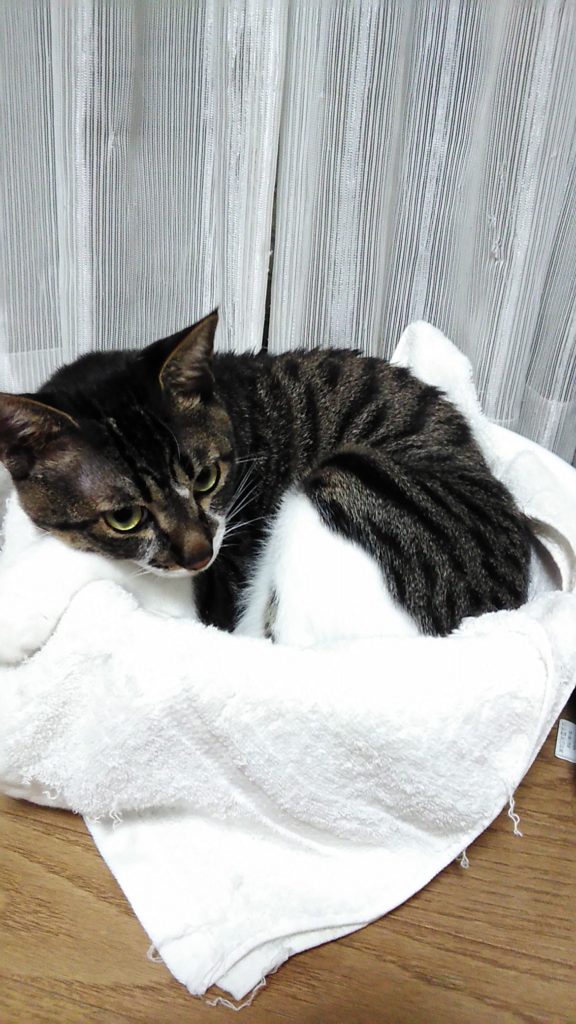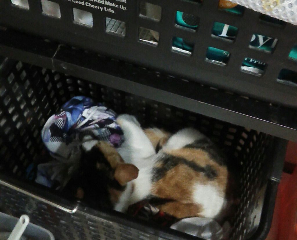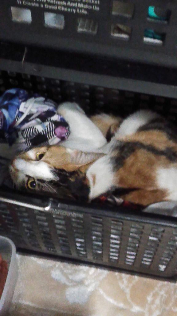 洗面所で仕事に行く支度をしていたら、こぶちが洗濯カゴの中でくつろぎ始めました😊