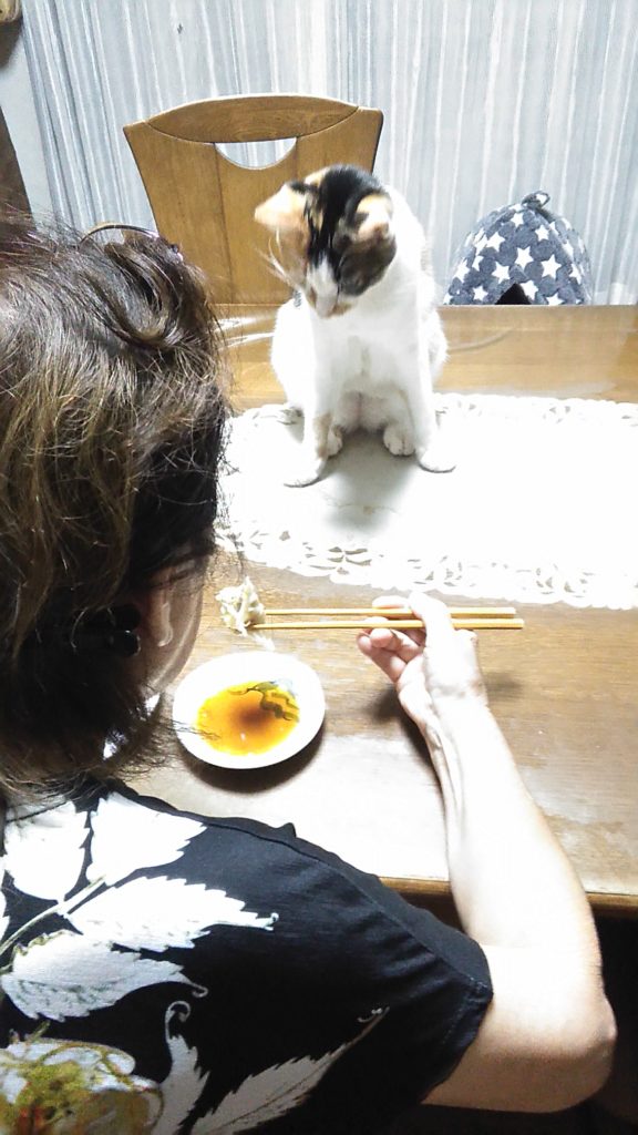 ばぁばが夕飯食べているのを欲しそうにジーッと見つめるチッチとこぶち😰💦