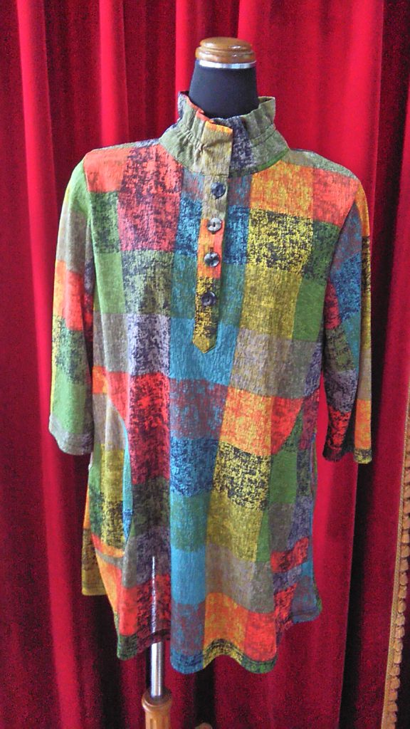 入荷したてのホワイト×BIRD・チュニック、カーキ×オレンジ×チェック・チュニック