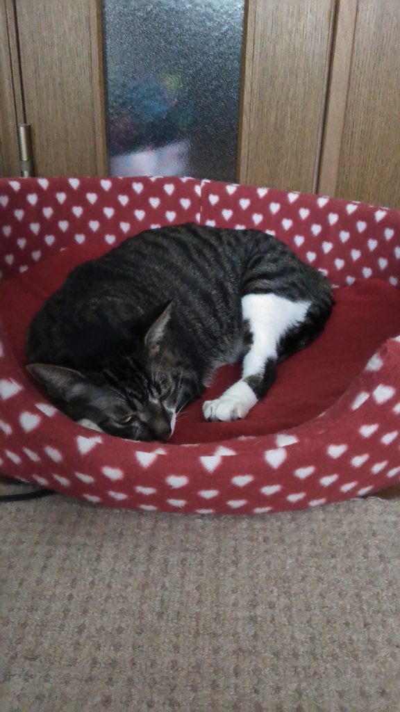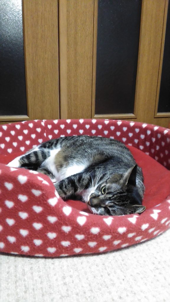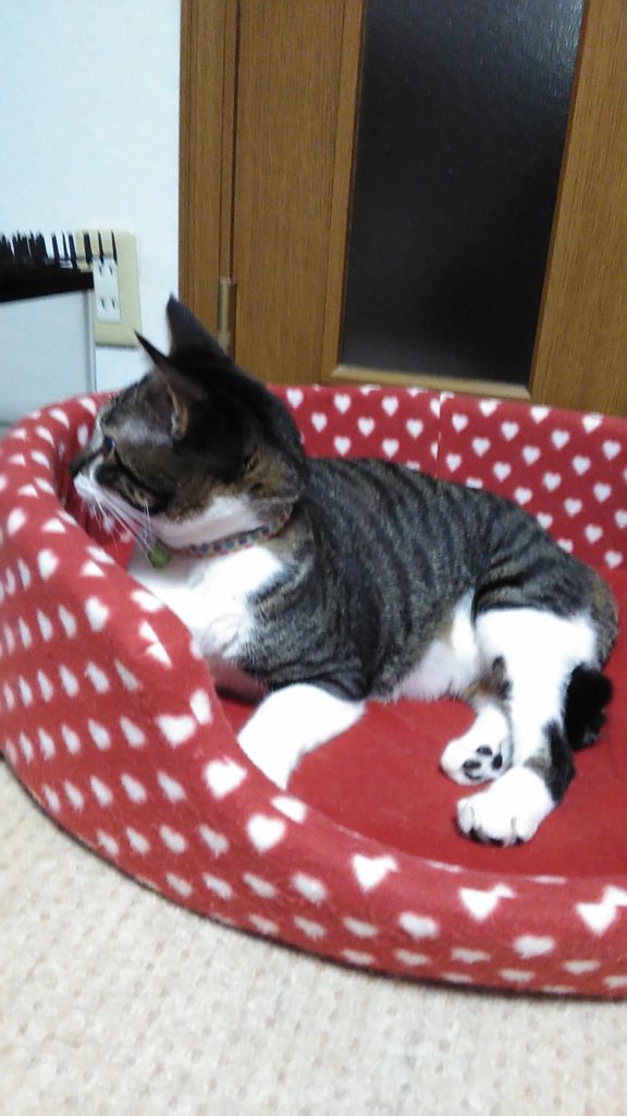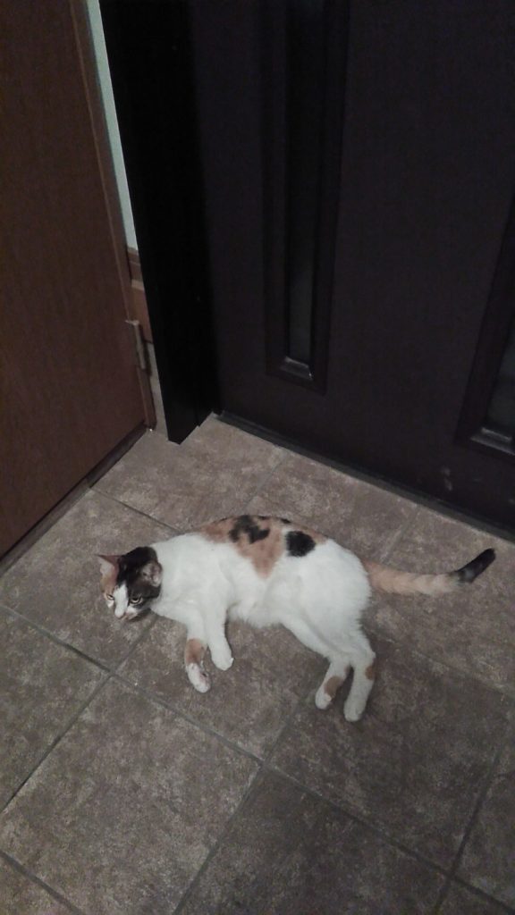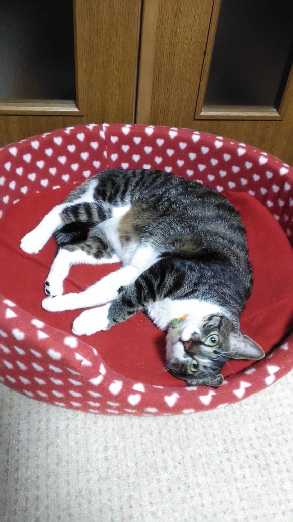 玄関の桃の箱で帰りを待っていてくれたこぶち💕