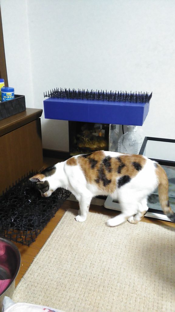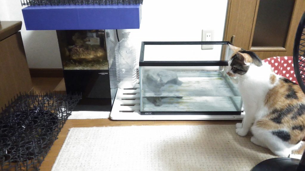 ニャニャ達が亀吉が入った洗面器の水を飲んでしまうので猫避けを置いています💦