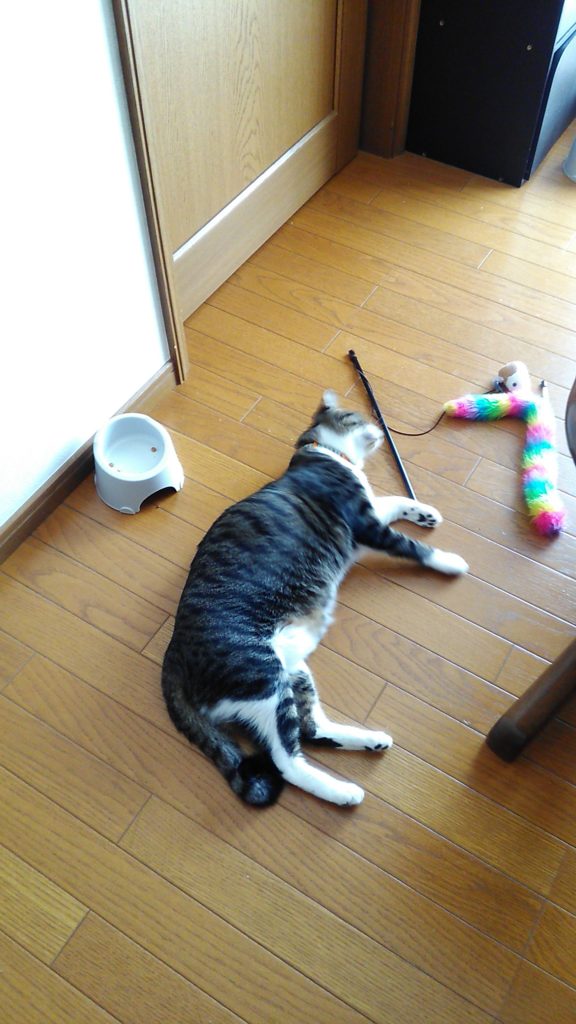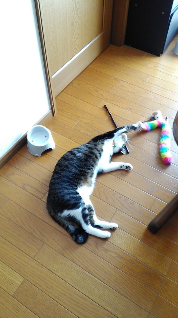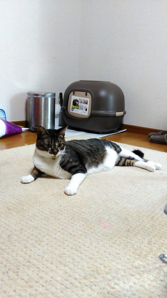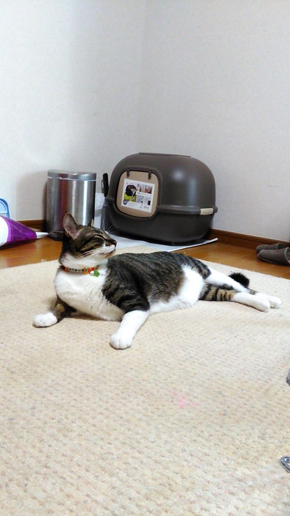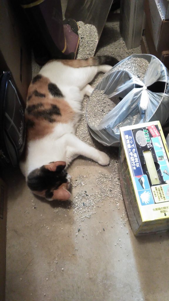 新品の猫砂の袋を破って、砂を撒き散らし、砂の上でゴロゴロ遊んでます😺🎵