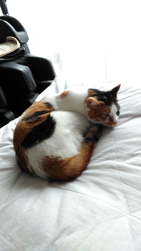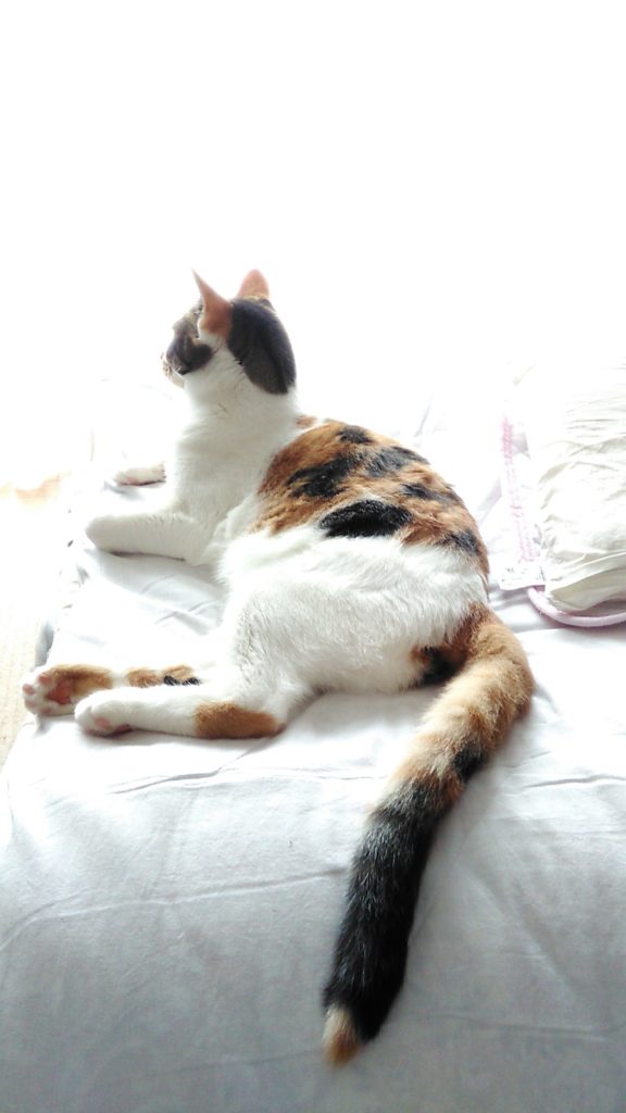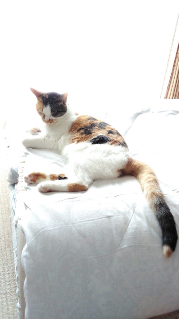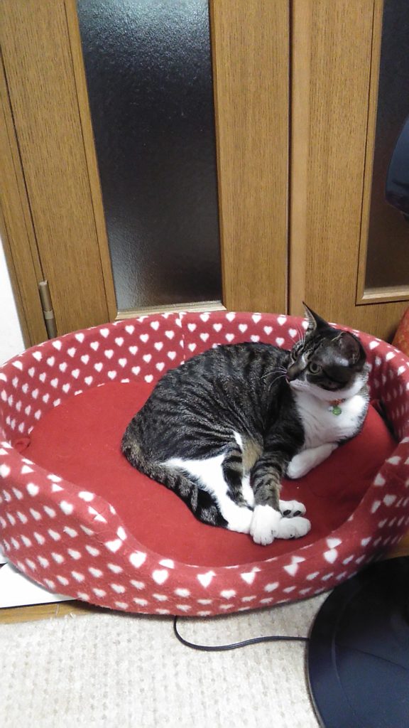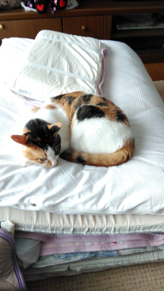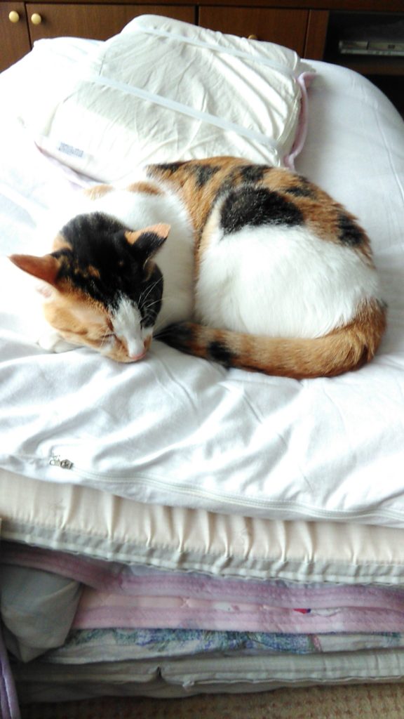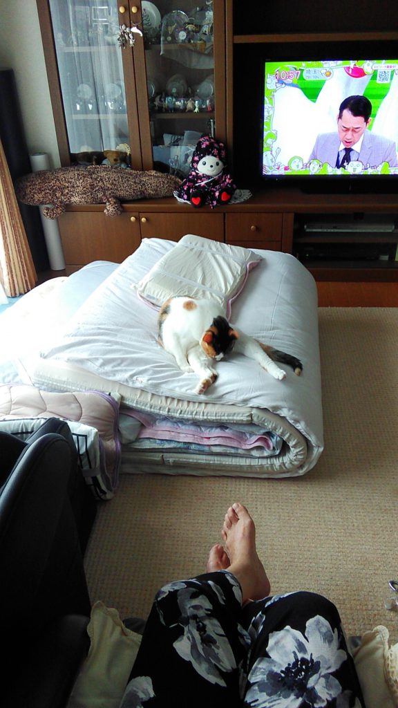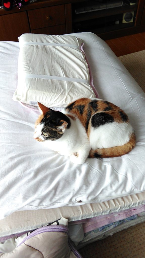 こぶちがめずらしく畳んだ布団の上でくつろいでます😺💕