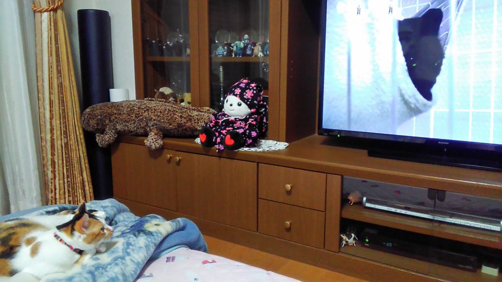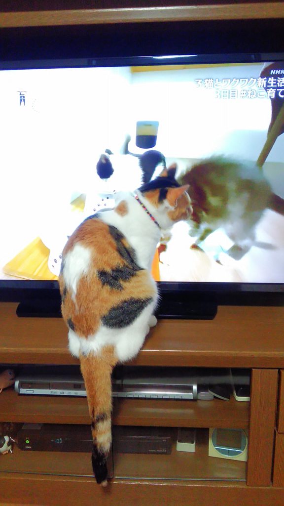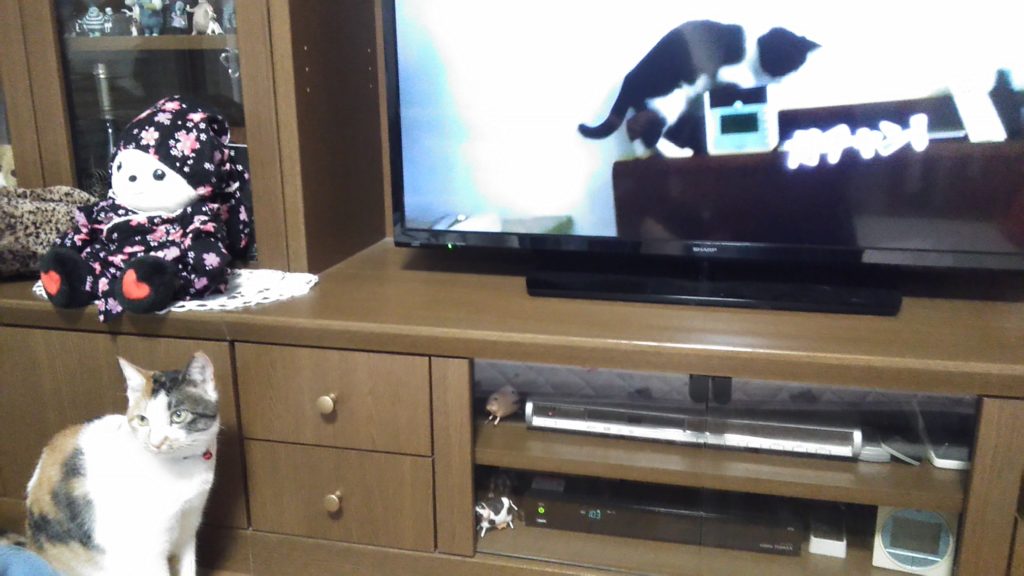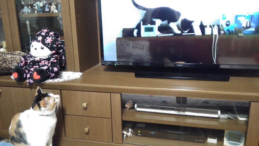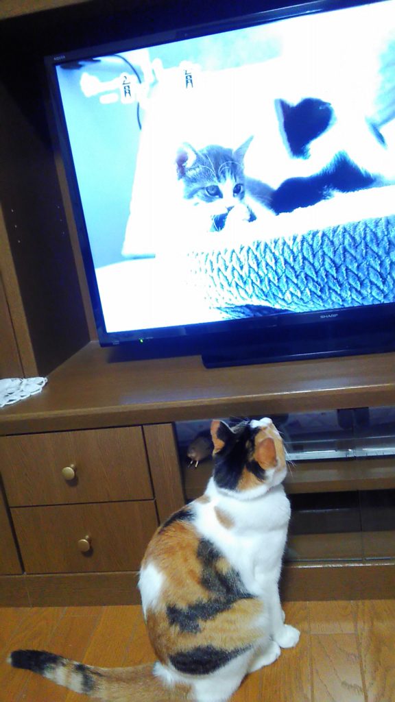 夕飯前、テレビで保護猫やってたので見てたらこぶちも来て一緒に見ました😺📺