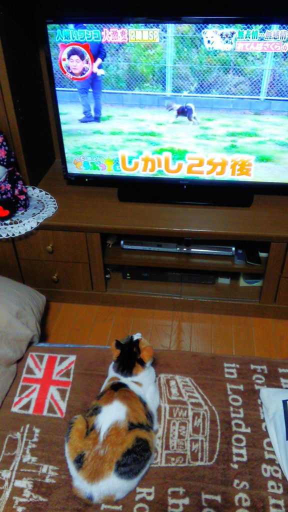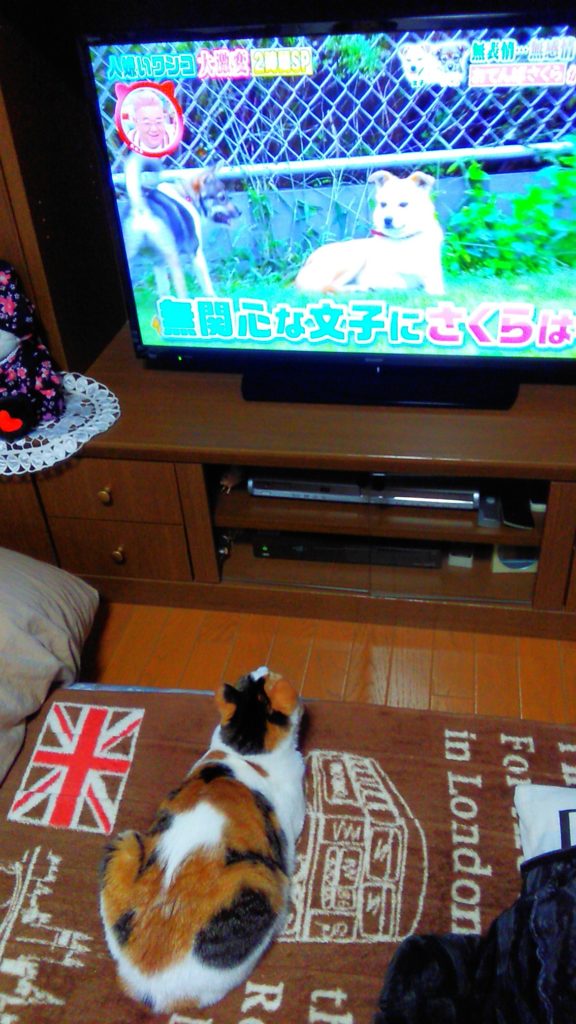 テレビに猫ちゃんとワンちゃんが出ていたら、一等地でこぶちが見ていました📺😺🐶