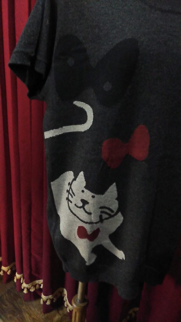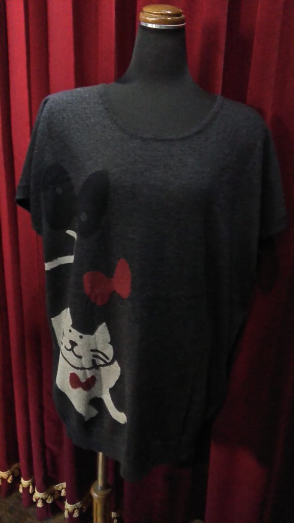 入荷したてのブラック×レッド柄・ニットタートル、新品のマンハッタナーズのグレー×CAT・ニットチュニック、グリーン×ローズ・ミニスカーフ