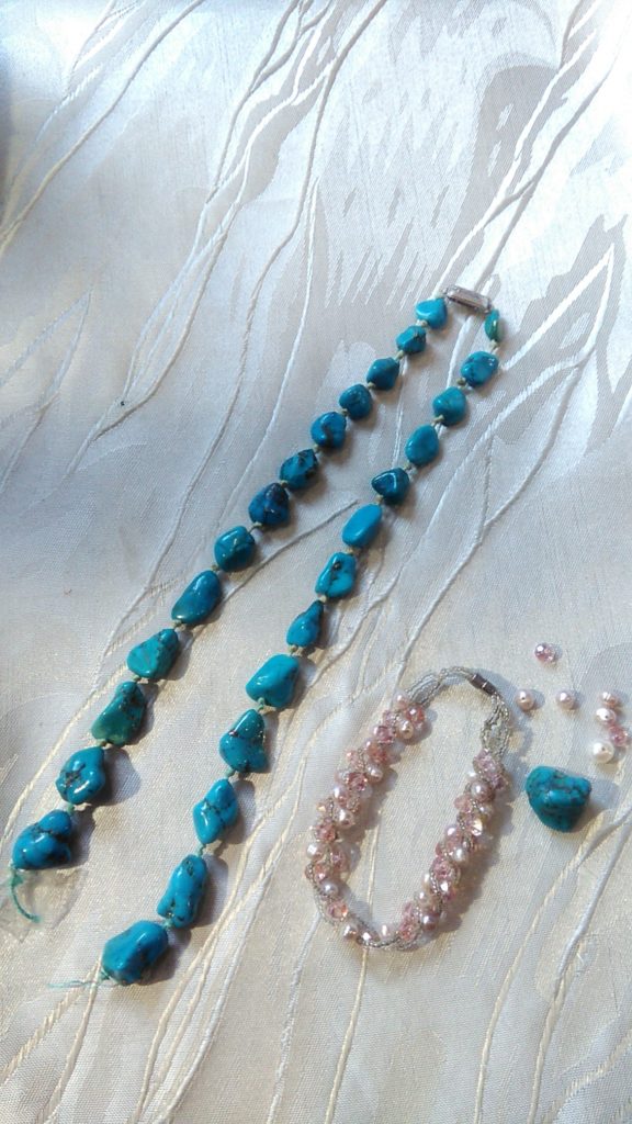 そして、バラバラになってしまったターコイズ・ネックレスとブレスレットの淡水パールを使用して、ターコイズ・ネックレスとピアスにリメイクしました👍