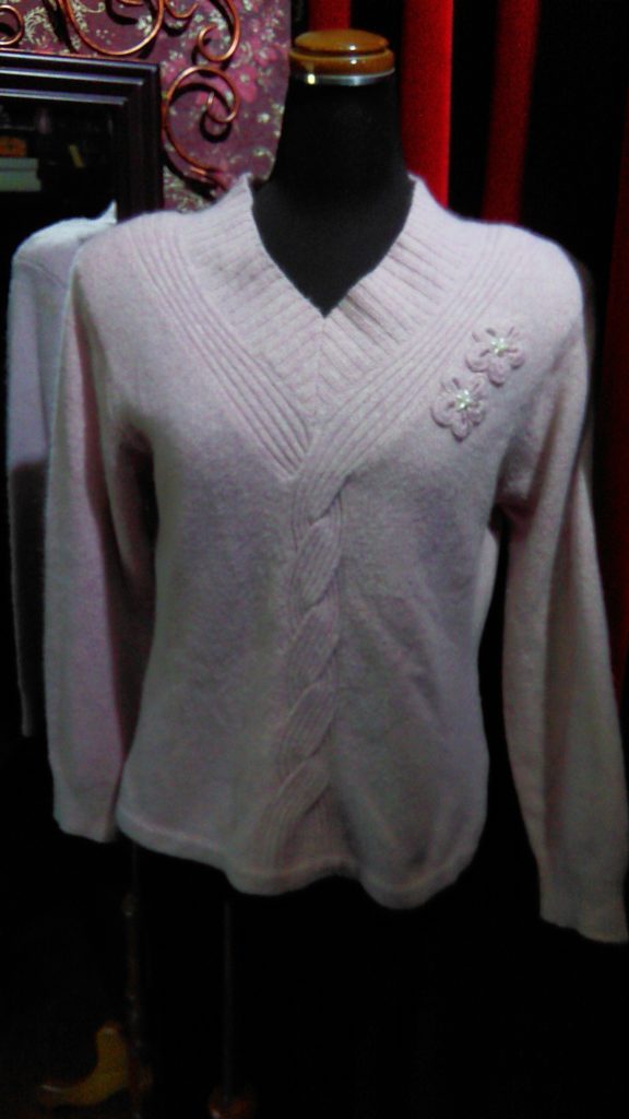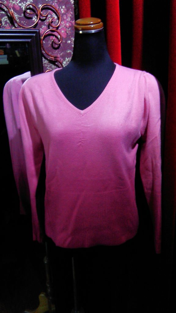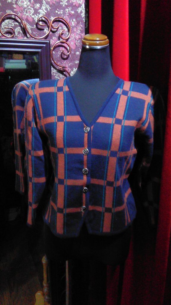 ピンク・セーター、ピンク×グラデーション・セーター、オレンジ×カーキ柄・カーディガン、ネイビー柄・カーディガン、レッド×ブラックチェック・ブラウス