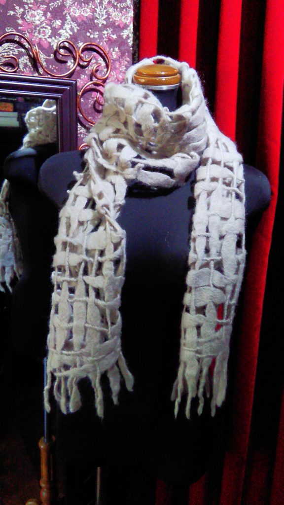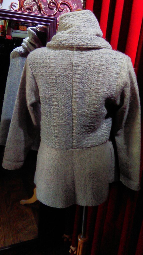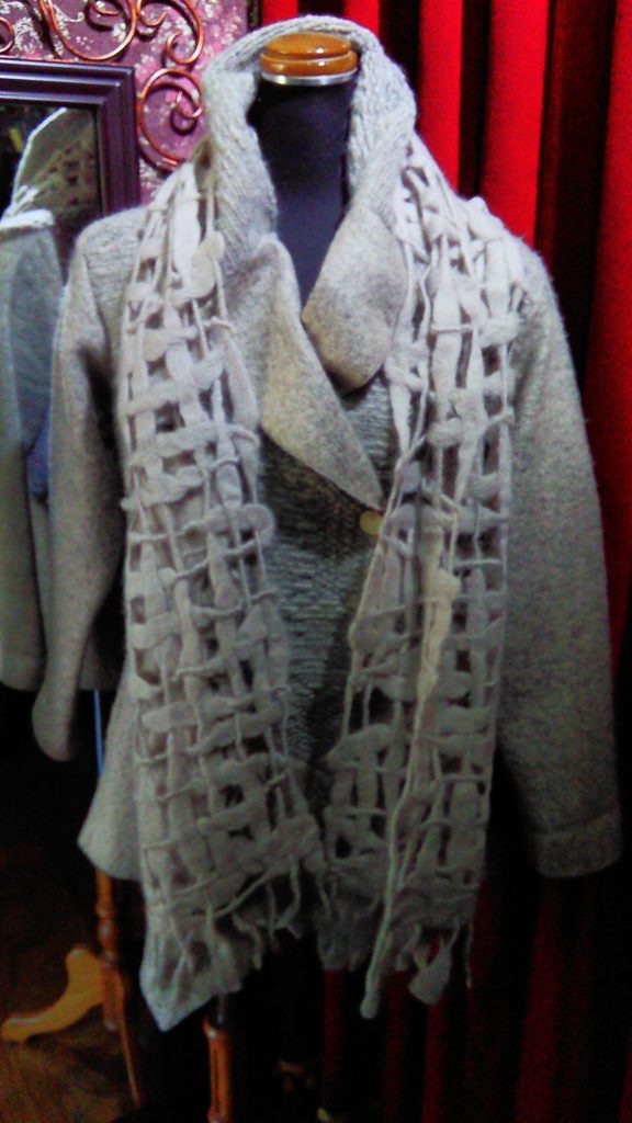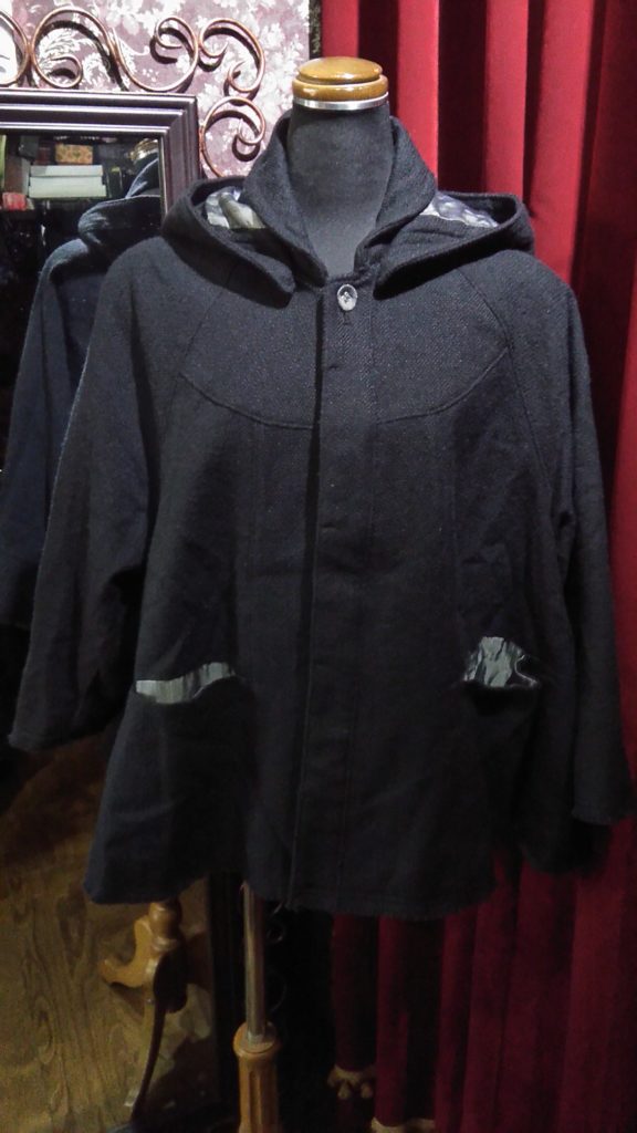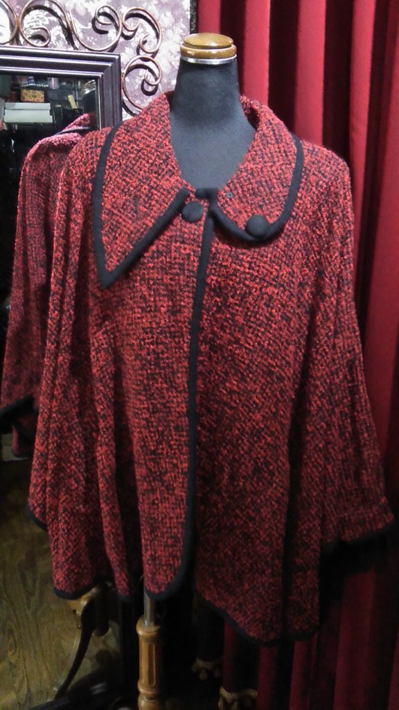 入荷したてのグレー・ジャケット、あわせてグレー・マフラー、レッド柄・マントコート、ブラック・ハーフコート、グレー・チュニック
