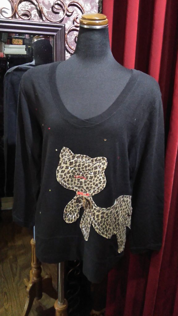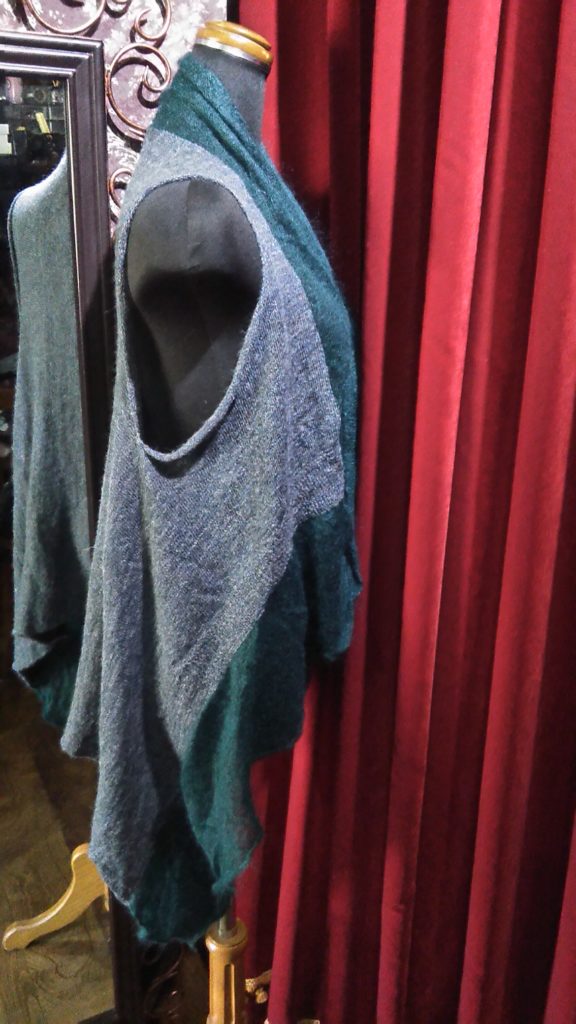 グレー・ハーフコート、グレー・マフラー、ホワイト×グレー柄・ニットチュニック、グレー×モスグリーン・ニットベスト、ブラック×CAT・チュニック