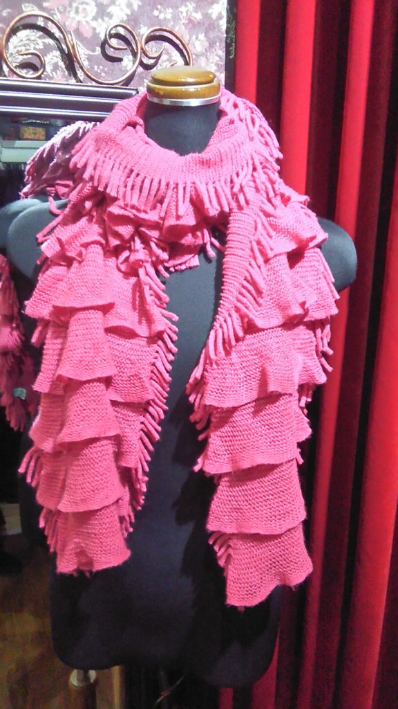 入荷したてのブラック×レッド柄・グラデーションハーフコート、伊太利屋のレオパード・ハーフコート、ピンク×フリル・マフラー
