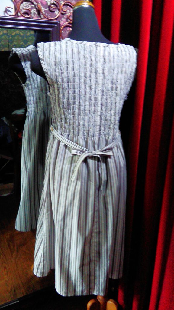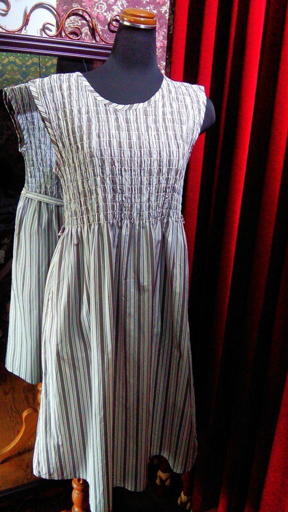 新品のダンガリー×シャーリング・ジャケット、ブラウン・チュールカーディガン、ホワイト×ストライプ・ワンピース