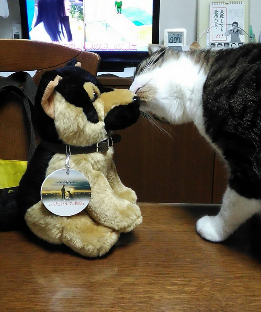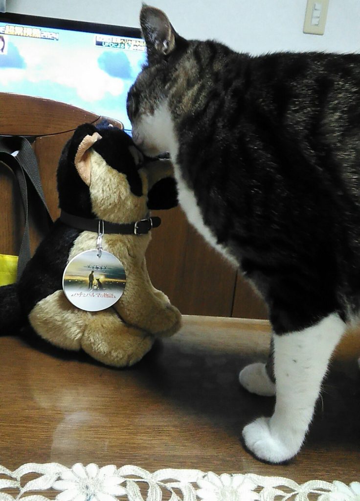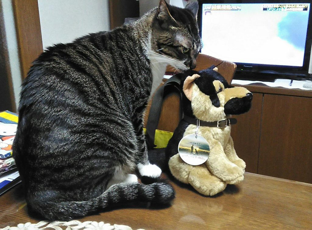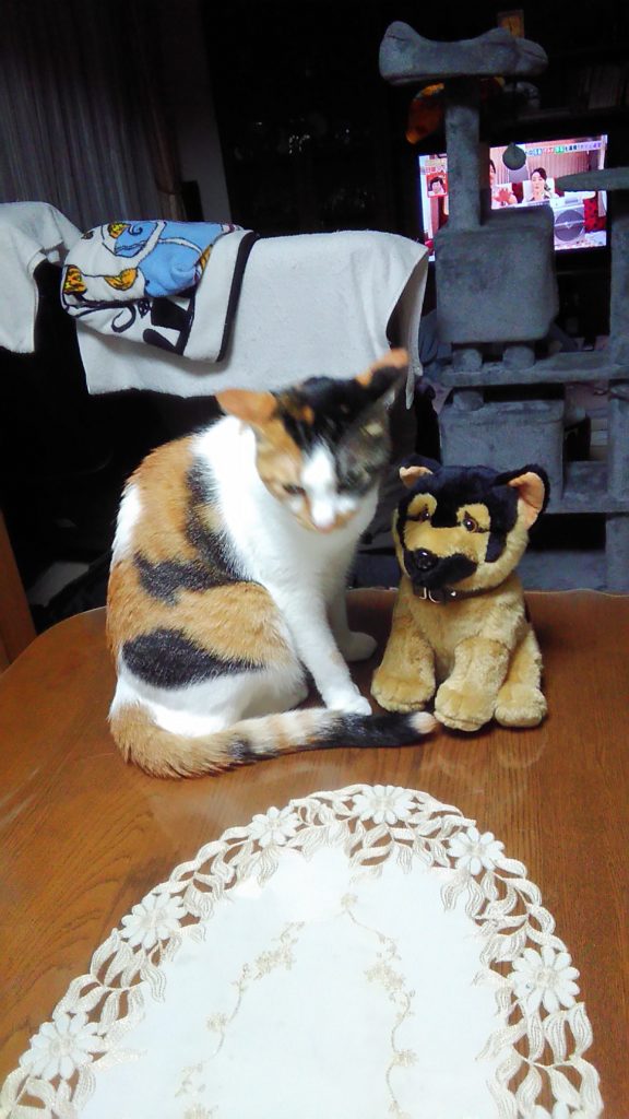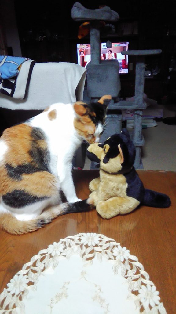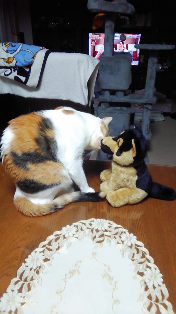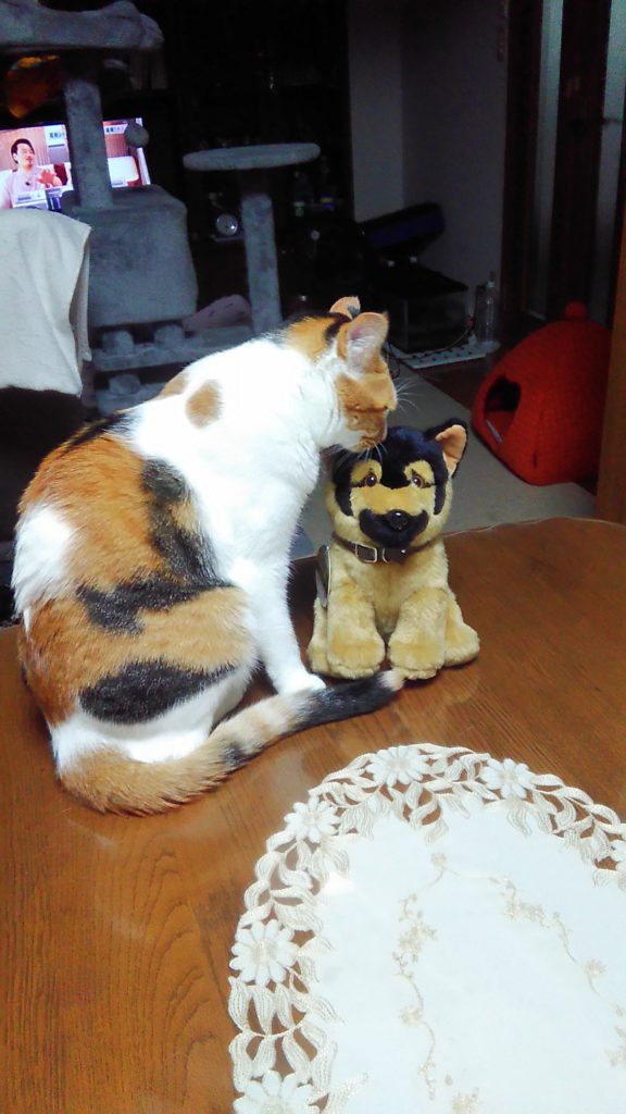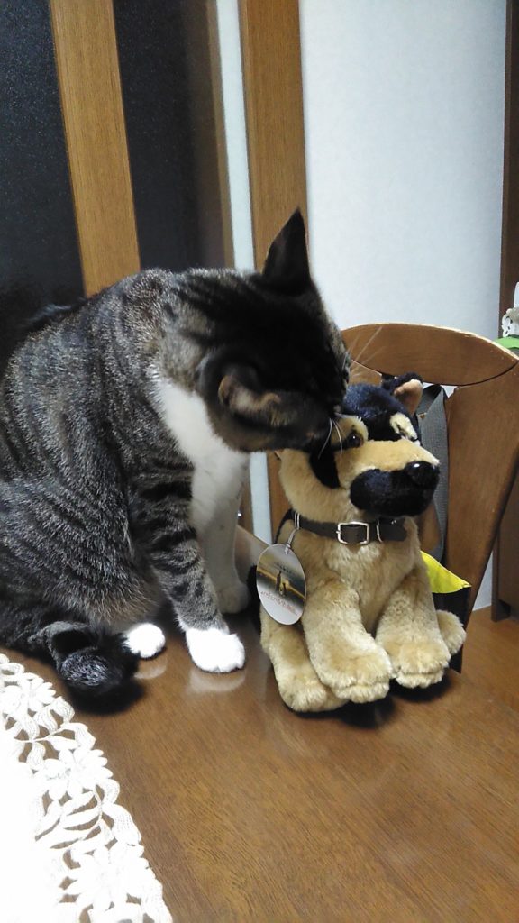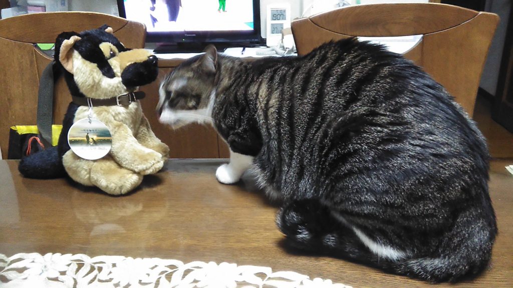 お客さまが持ってきてくれたワンちゃんがかわいかったので家に持ち帰ったら、ニャニャ達が興味しんしん😺😺🐶