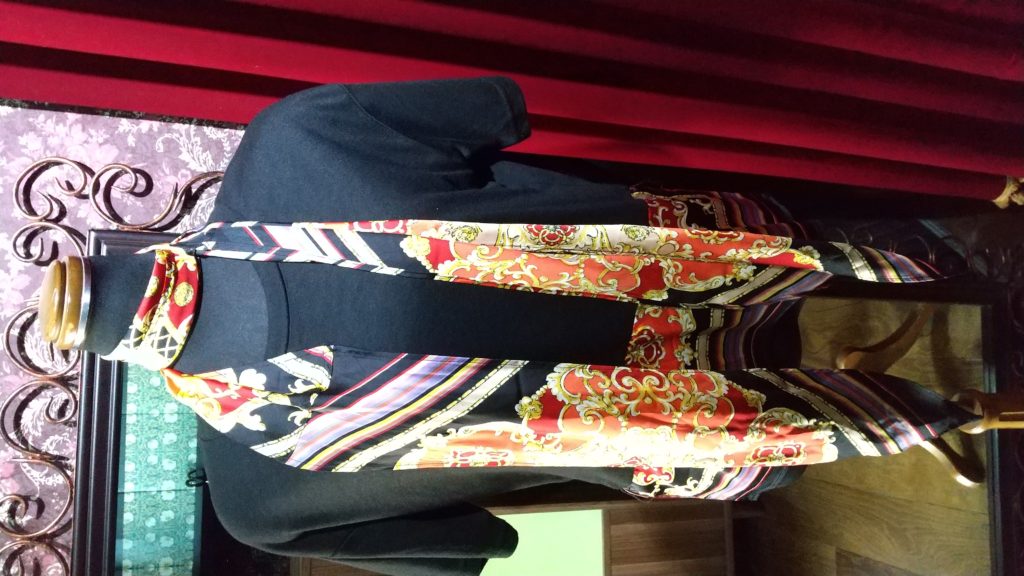入荷したての、ブラック×オレンジ柄・ストール付きチュニック