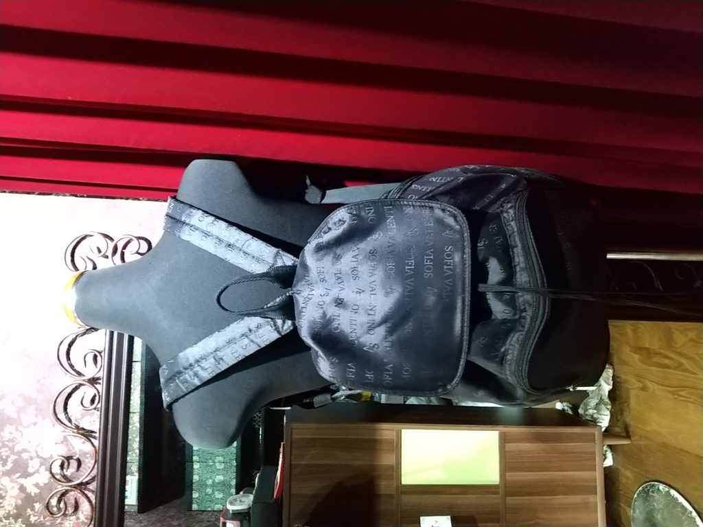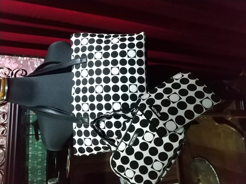 ブラック×英字柄・リュックサック、レブロンのホワイト×ドット・バッグ&化粧ポーチ&アクセサリーポーチをお買い上げくださいました👗👜👝