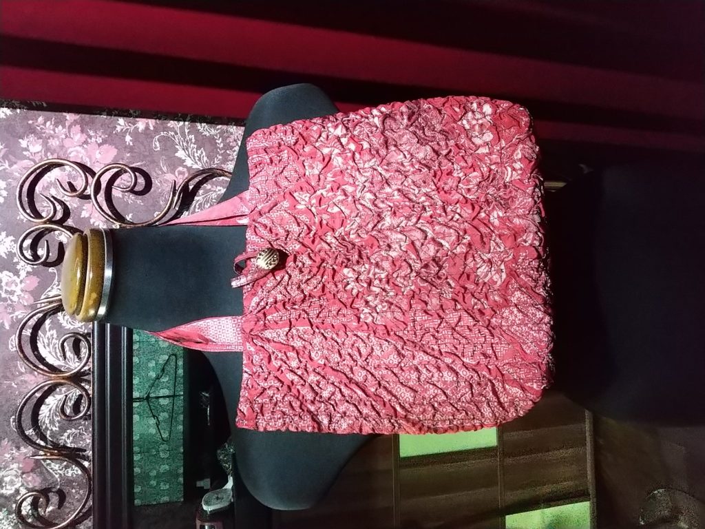 そして、オレンジ・ブラウスコート、ブラックMIX・ジップジャケット、手作りのレッド柄×シャーリング・ミニバッグ