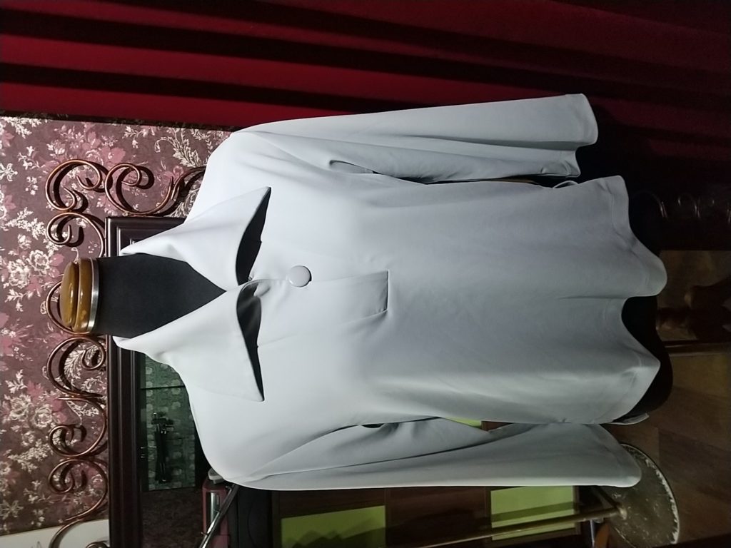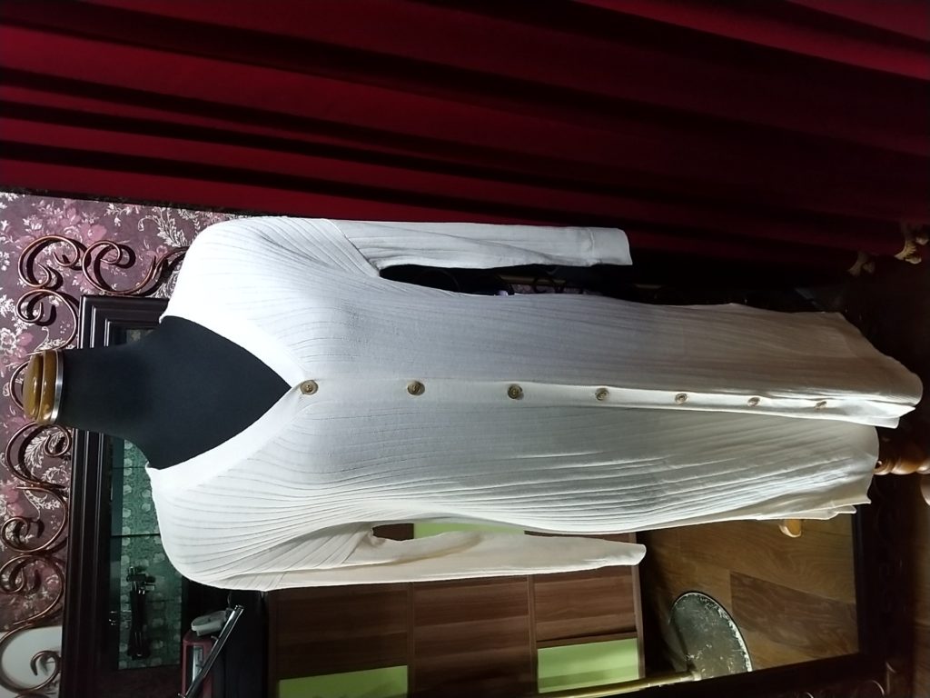 グレー×レース・ベスト、レッド・ジャケット、オフホワイト・ロングニットカーディガン