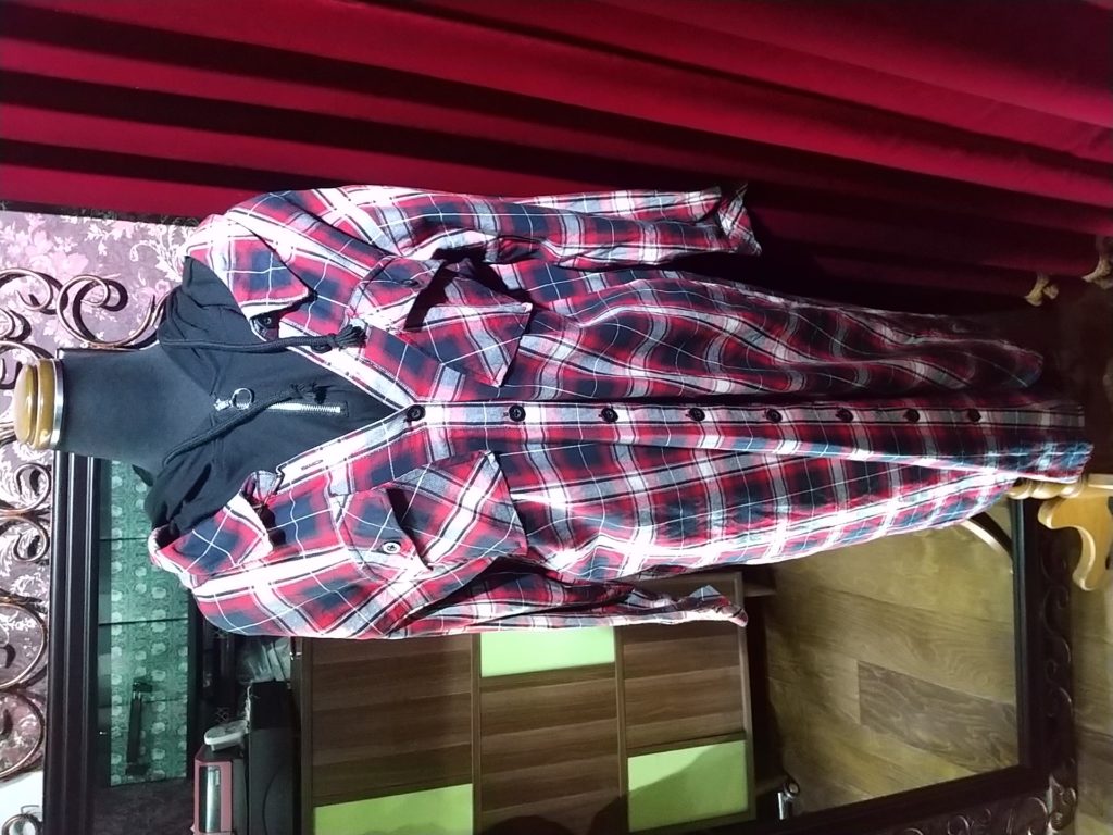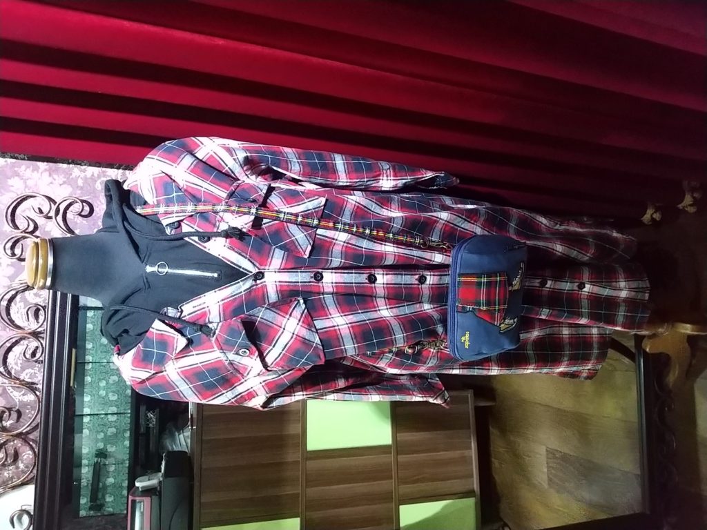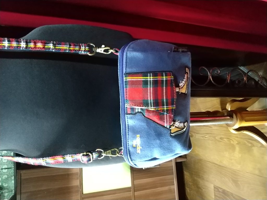 新品のネイビー×フラワー・ロングワンピース、レッド×チェック・ロングブラウス、ネイビー×チェック・ショルダーバッグ、シルバー×ラインストーンネックレス