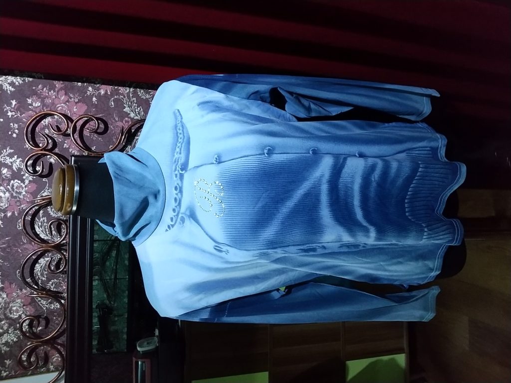 入荷したての、ライトブルー×転写プリント・チュールタートル、ブラック×小花・チュニック、ホワイト・セーター、ピンク・ジャケット、ブラック×刺繍・ブラウス、パープル柄・ロングワンピース