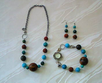 | No.3 Necklace 8900yen Wrist Watch 8900yen (Braceletのみ6900yen) Ear Ring 3900yen (ターコイズ、クリソコラ、WOODを使用) (Necklaceがアレンジできます) (全てSOLD OUT) |