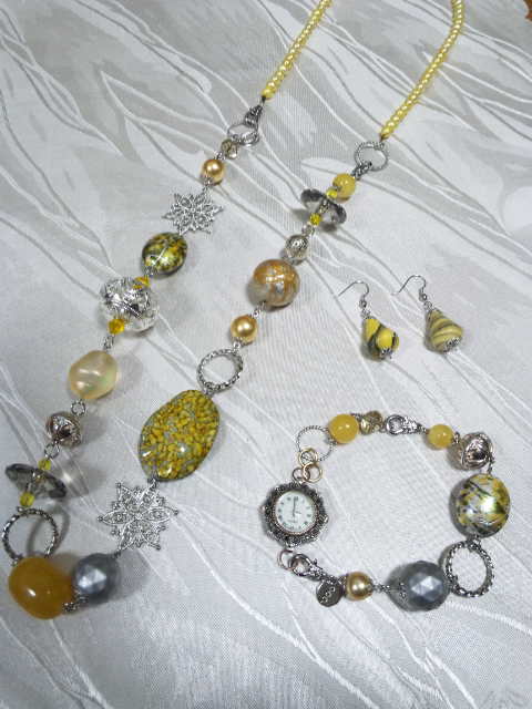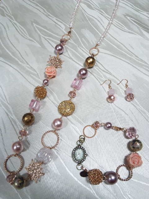 No.14 Necklace 15800yen Wrist Watch 9900yen (ブレスレットのみ7900yen) Pierce 2900yen (淡水パール、アメリカンビーズ、ヴィンテージビーズ等を使用) (ブレスレットをプラスすると、色々とアレンジできます) |