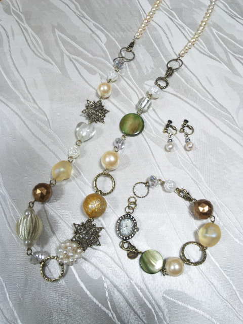 No.16 Necklace 15800yen Wrist Watch 9900yen (ブレスレットのみ7900yen) Pearl Ear Ring 2900yen 転写パール Ear Ring 2900yen (SOLD OUT) (淡水パール、アメリカンビーズ、ヴィンテージビーズ、シェル等を使用) (ブレスレットをプラスすると、色々とアレンジできます) |