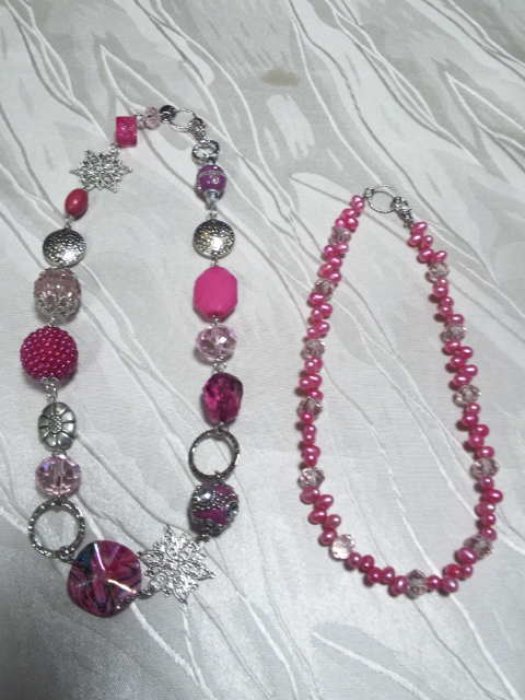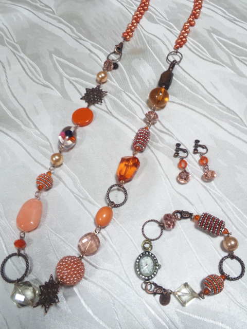 No.10 ネックレス 15800円 時計 9900円 (ブレスレットのみ7900円) イヤリング 2900円 (淡水パール、アメリカンビーズ等を使用) (ブレスレットを繋げると色々とアレンジできます) |